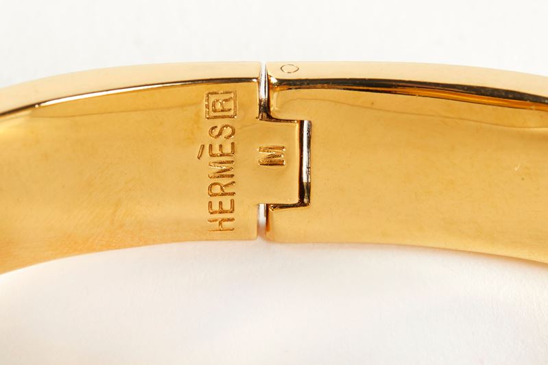 HERMÈS Bracciale rigido modello Clic H in metallo dorato e smalto nero. Cm 6x5,5. Reca marchio Hermès.