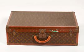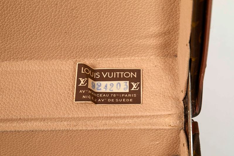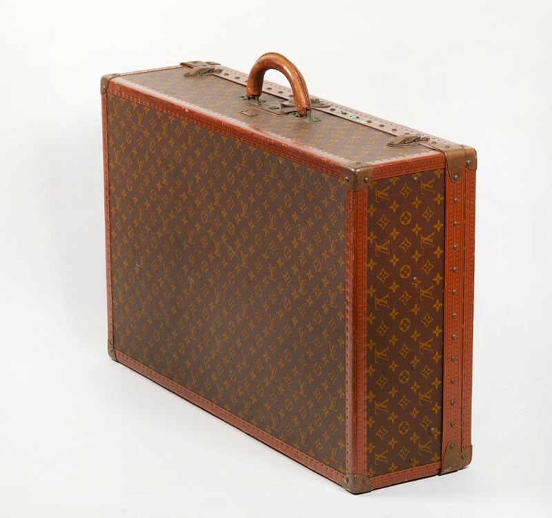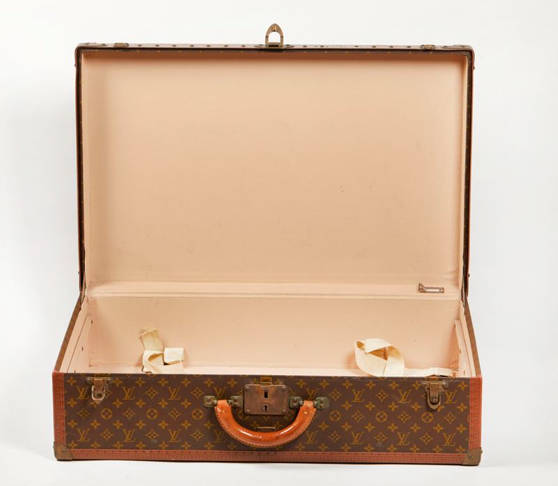LOUIS VUITTON Valigia modello Alzer 75 in tela Monogram con bordi e profili rinforzati in cuoio naturale. Ferramenta in ottone massiccio con tipica patina d’epoca: serratura centrale e due chiusure laterali a scatto. Anni ’60. Cm 50x75x22. Reca etichetta Louis Vuitton. (difetti)