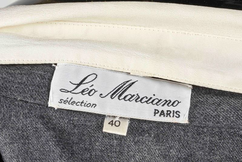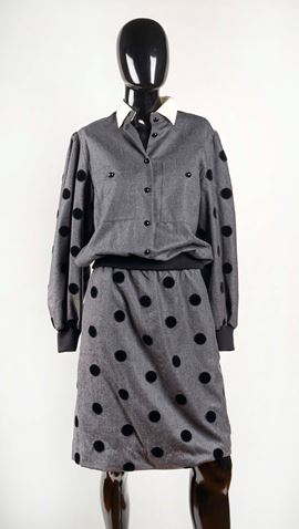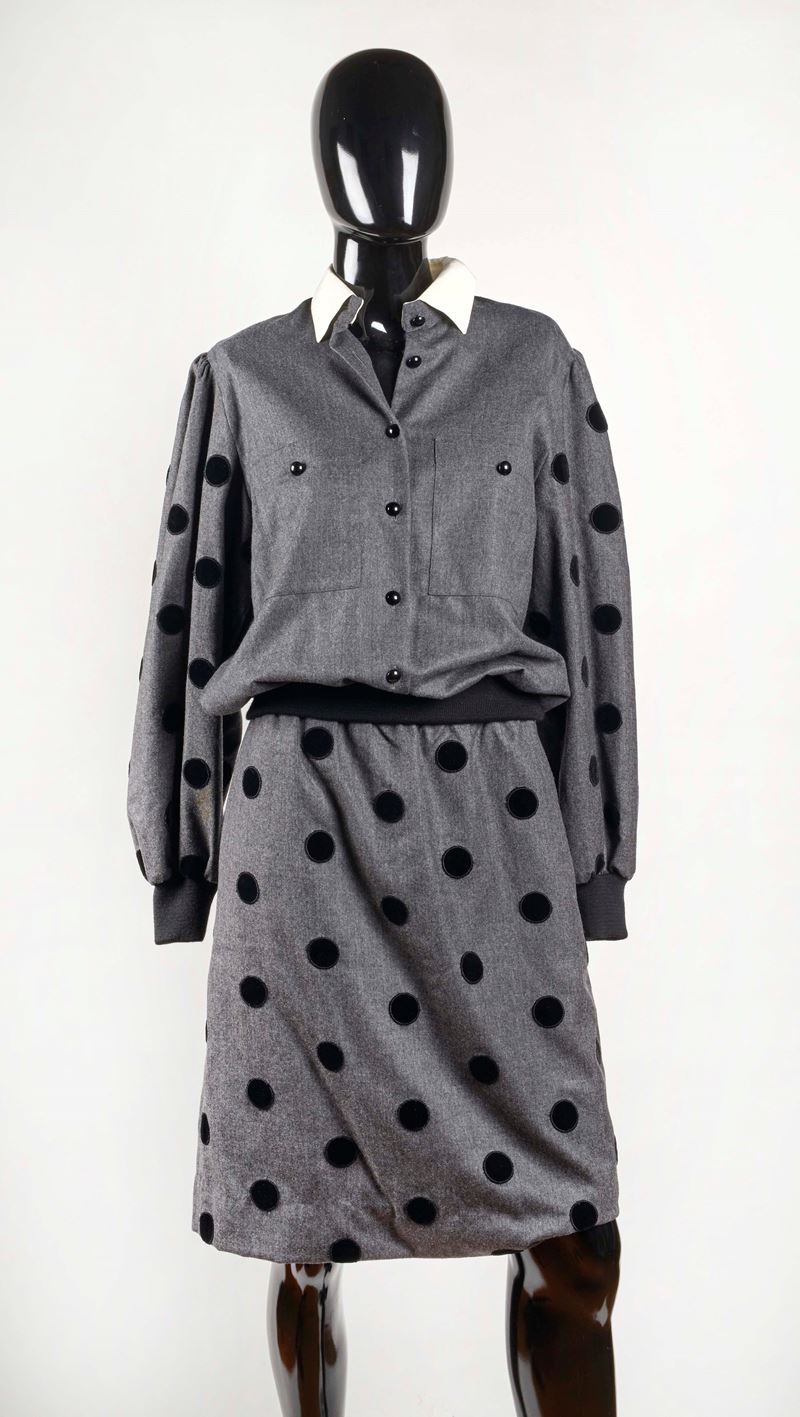 LEO MARCIANO Completo giacca corta e gonna in lana e cachemire grigio con decorazione a pois in velluto nero. Taglia IT 40. Reca etichetta Leo Marciano Paris. (difetti)