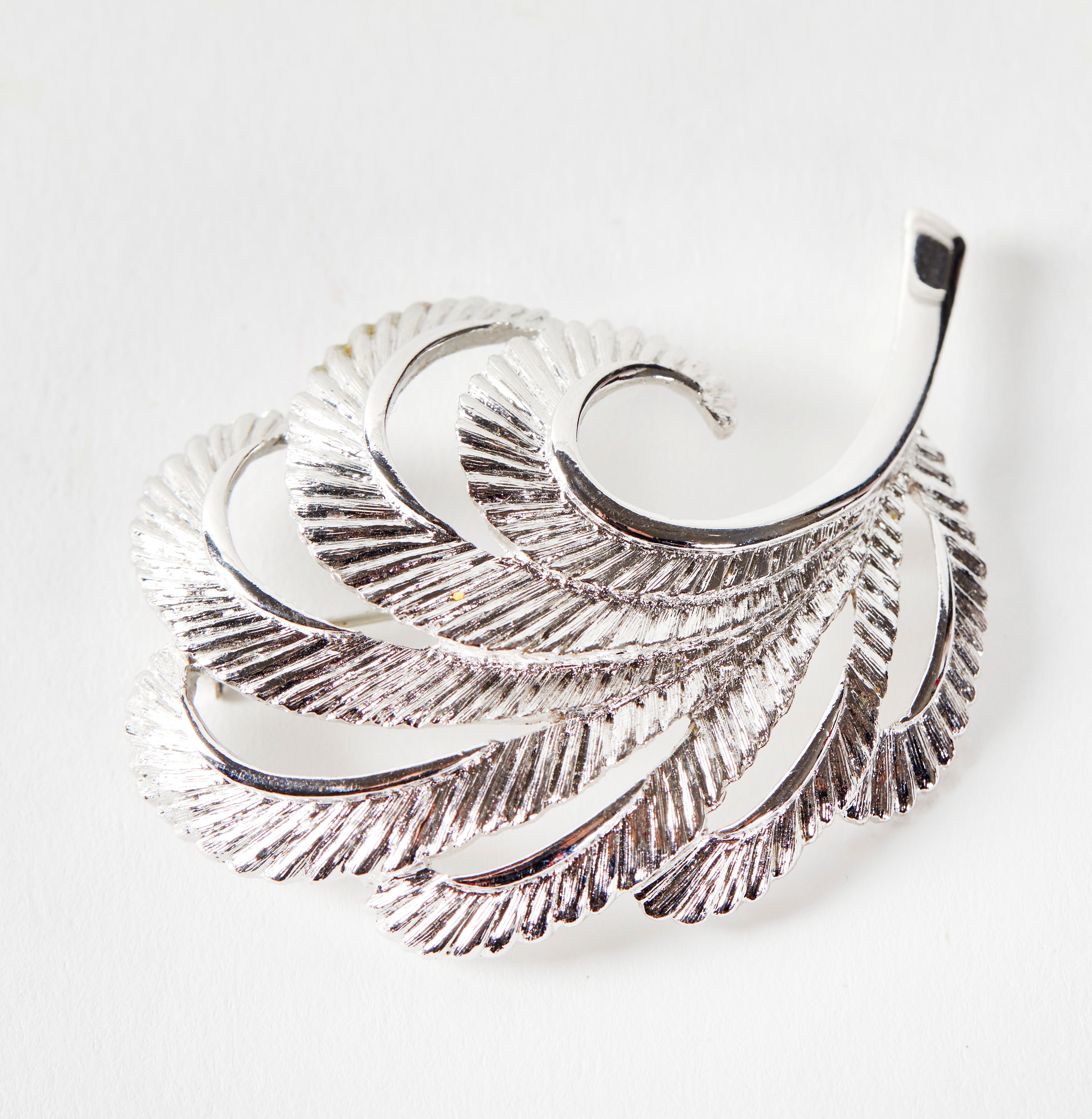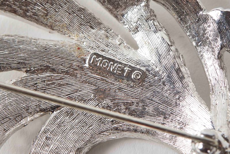 MONET Spilla in metallo argentato a forma di foglia. Cm 6x4,5. Reca marchio Monet.