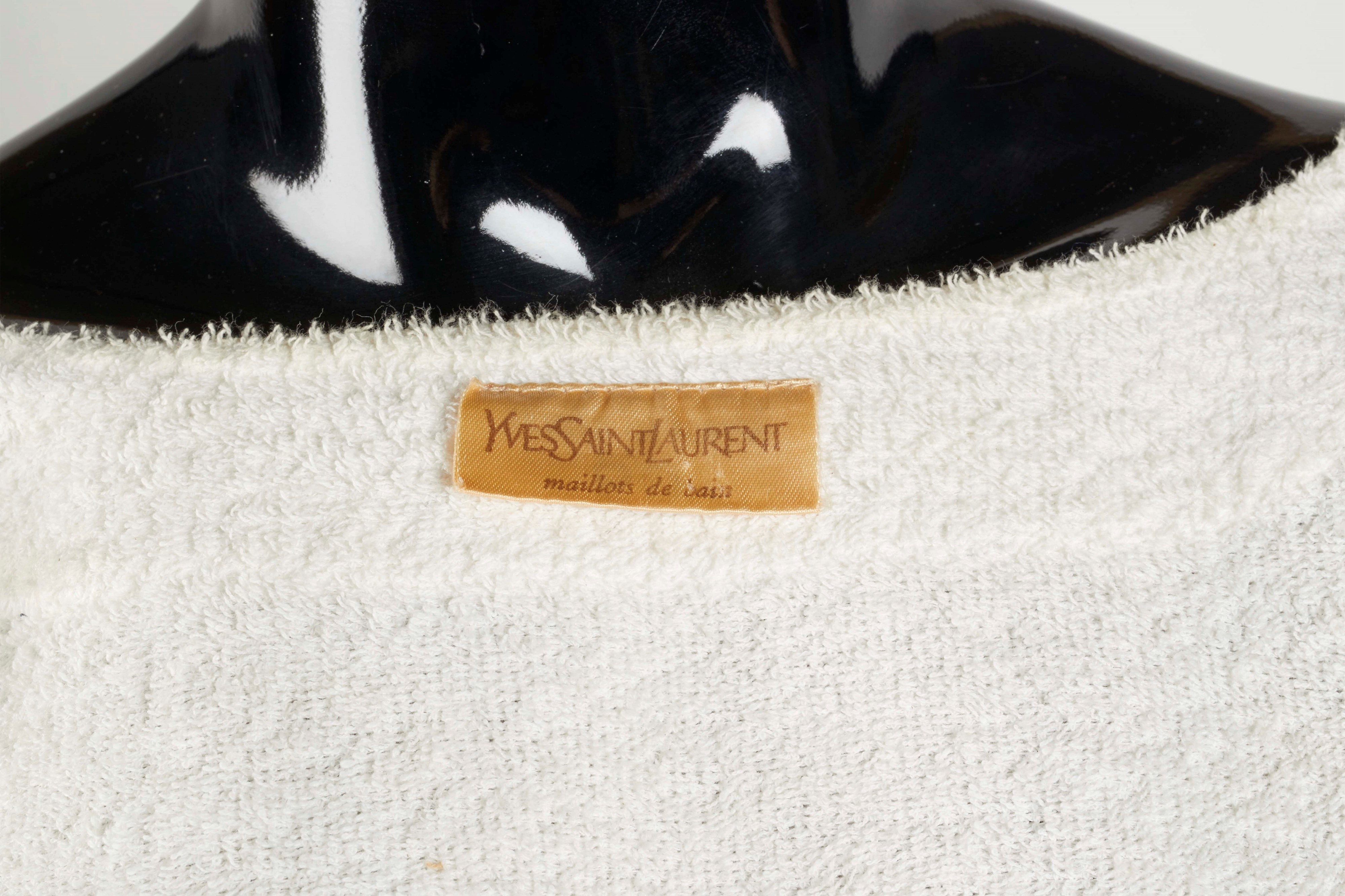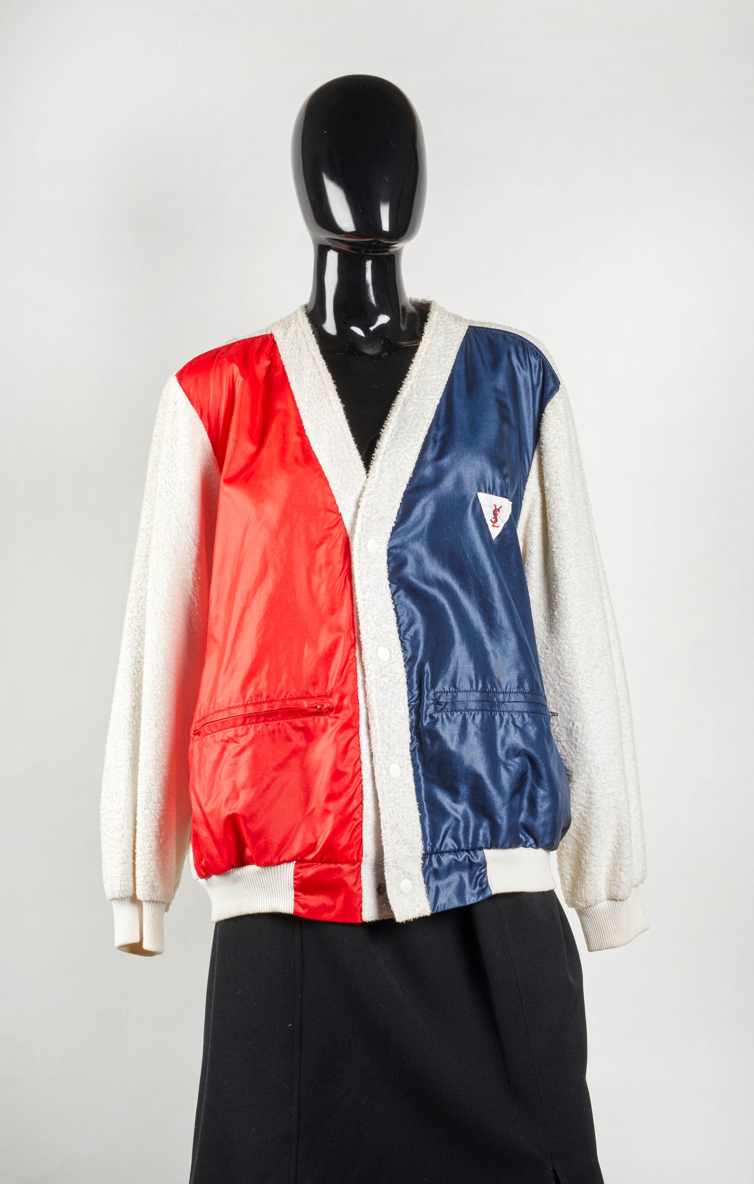 YVES SAINT LAURENT Maillots De Bain Giacca modello bomber realizzato in spugna di cotone bianca con inserti in tessuto sintetico rosso e blu e logo ricamato. Taglia 50. Chiusura a bottoni automatici. (lievi difetti)