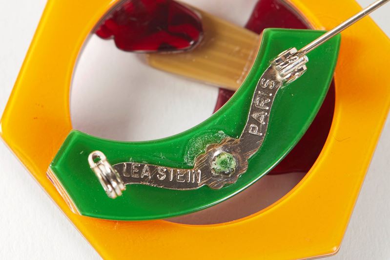 LEA STEIN Spilla in resina raffigurante figura con ombrello e arcobaleno. Cm 4x4,5. Reca marchio Lea Stein Paris.