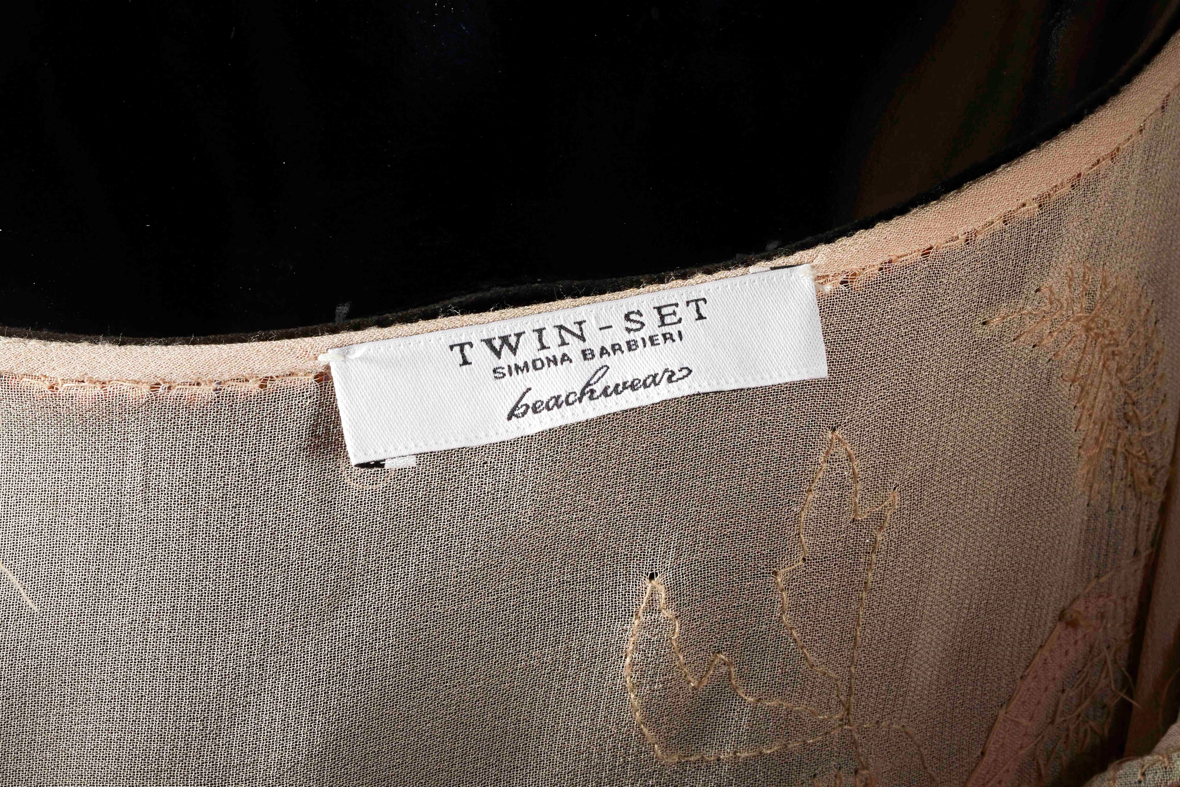 TWIN-SET Copricostume in viscosa semitrasparente rosa con applicazioni di paillettes e perline a decorazione floreale. Taglia T/U. Reca etichetta Twin-Set. (lievi difetti)