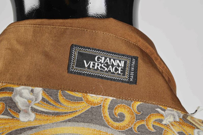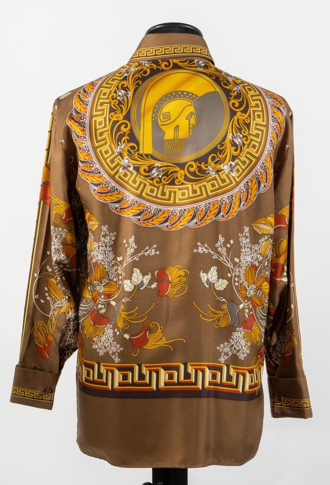 GIANNI VERSACE Camicia in seta sui toni del marrone e del giallo con fantasia a greche e fiori. Collezione Versace Mens Fall/Winter 2001. Taglia 48. Reca etichetta Gianni Versace, Made in Italy. (lievi difetti)