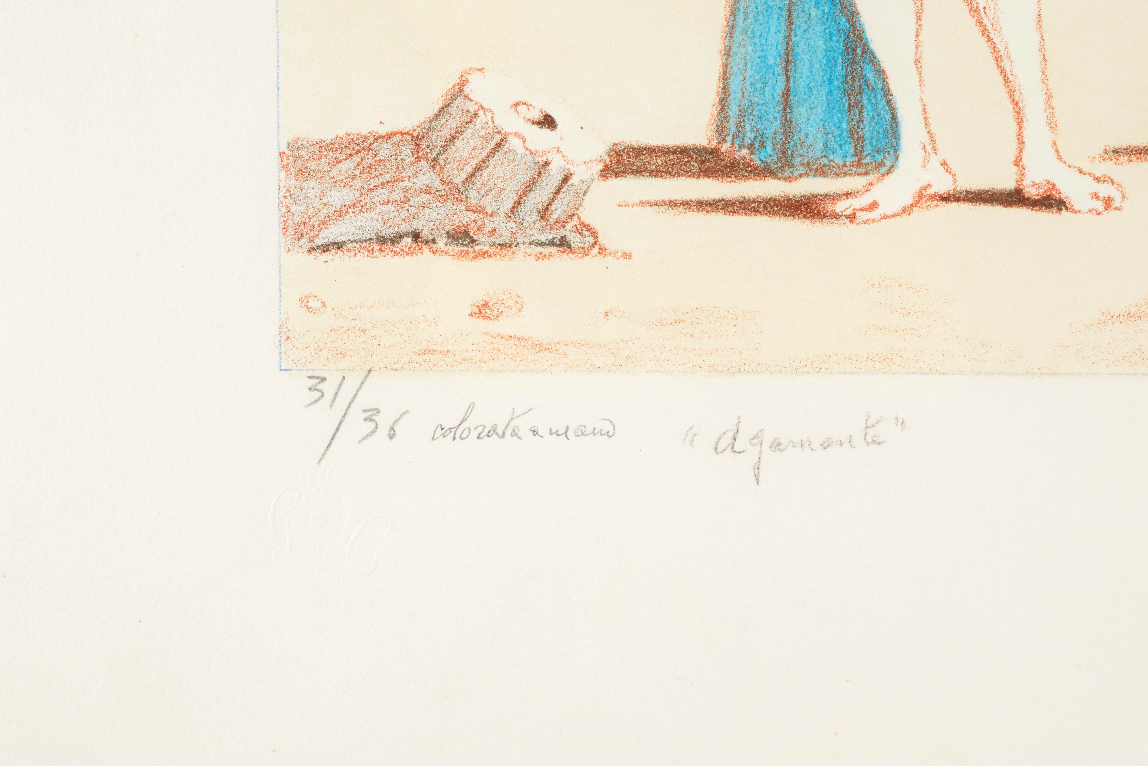 GIORGIO DE CHIRICO (Volos 1888 – Roma 1978) “Agamonte", 1974. Litografia a 5 colori su carta colorata a mano. Cm 53x39. Opera firmata in basso a destra G. de Chirico. Reca numeri di tiratura in basso a sinistra 31/36. Reca scritta colorata a mano. Reca timbro a secco di Alberto Caprini Stampatore Roma in basso a destra. Reca timbro a secco Giorgio de Chirico in basso a sinistra.