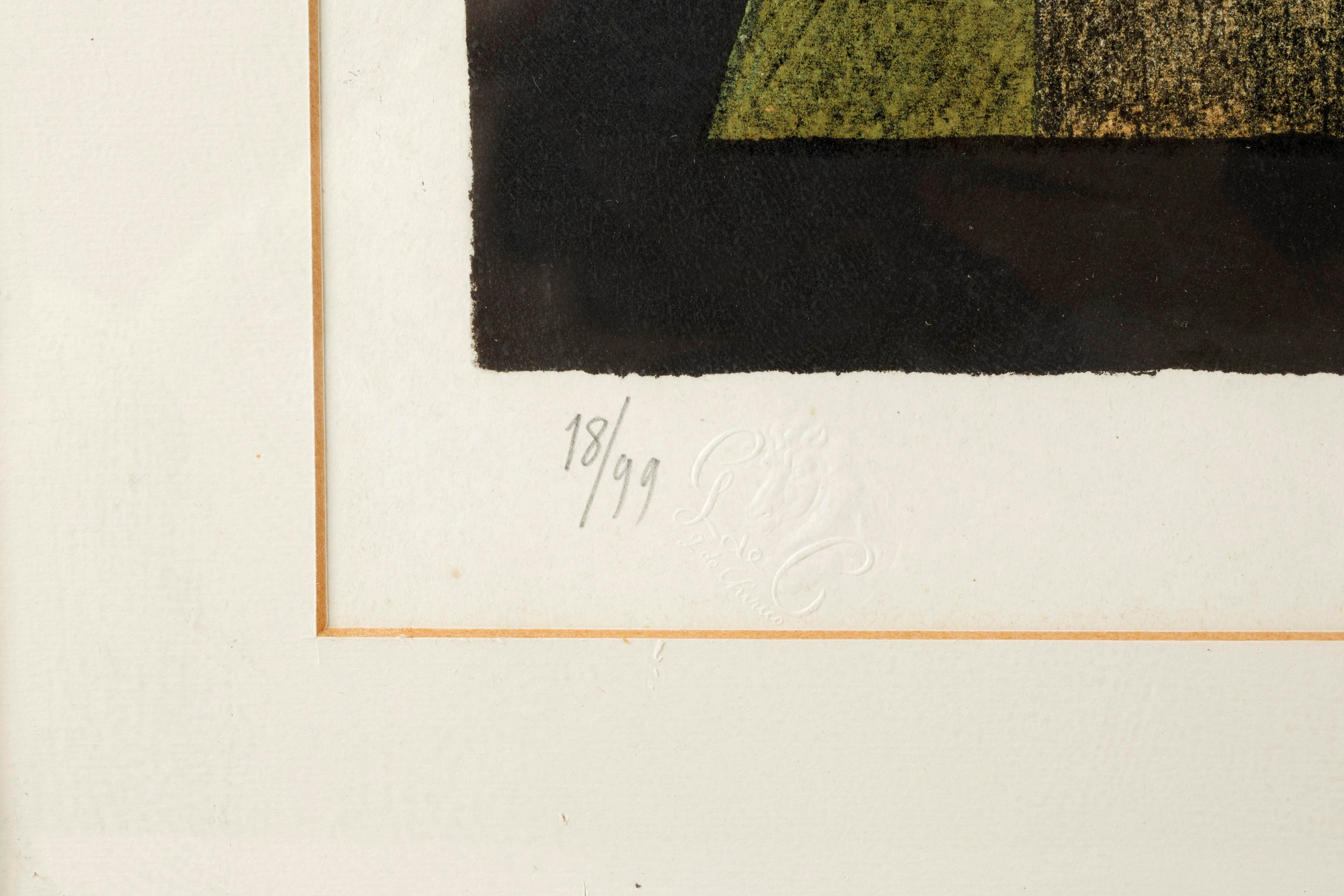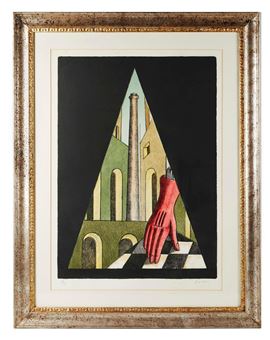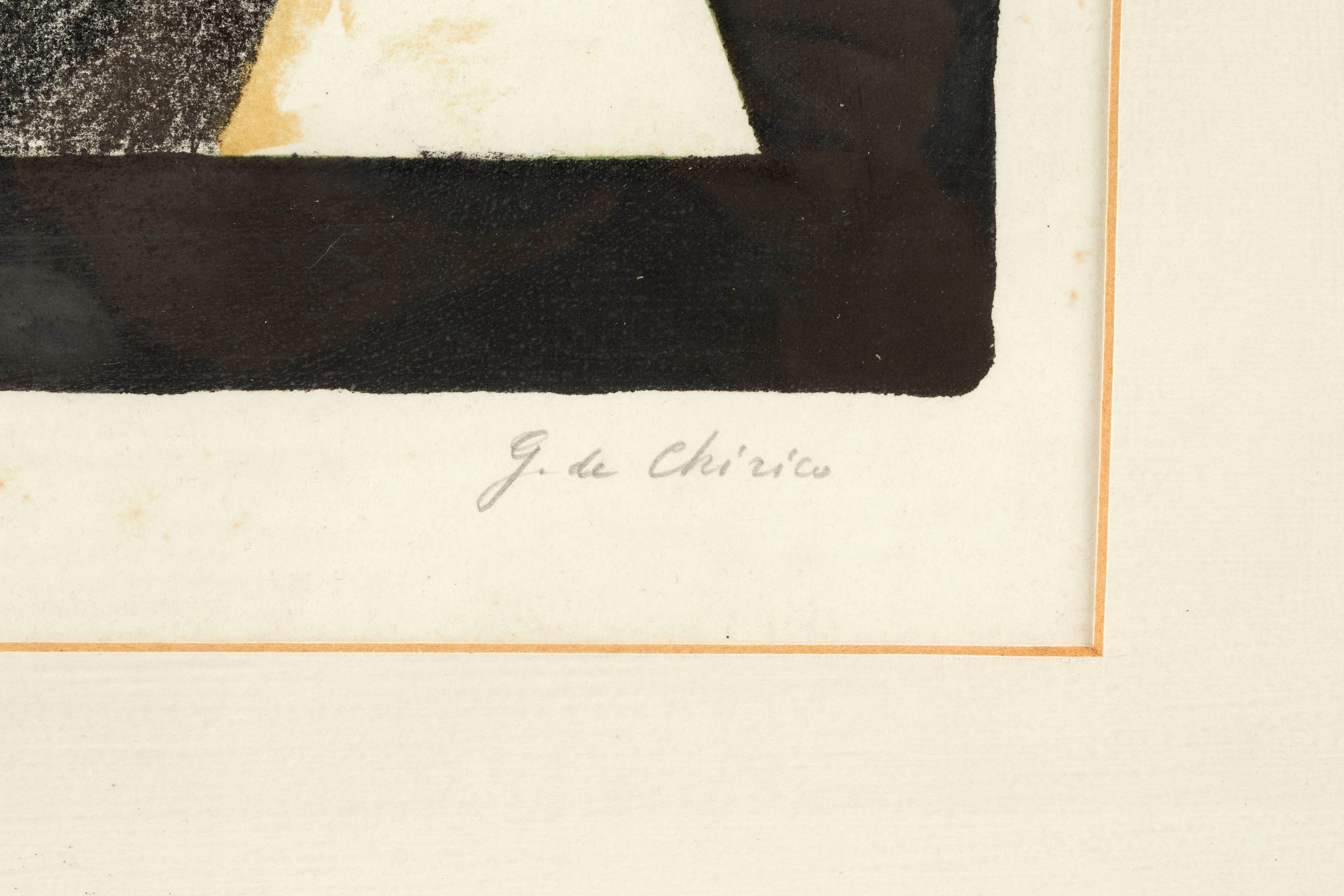 GIORGIO DE CHIRICO (Volo 1888 - Roma 1978) "Il guanto", 1975. Litografia a 8 colori su carta. Cm 75x55. Opera firmata in basso a destra G. de Chirico. Reca numeri di tiratura in basso a sinistra 18/99. Reca timbro a secco Giorgio de Chirico in basso a sinistra. Al retro reca etichetta Alberto Caprini Stampatore Roma a firma Alberto Caprini.