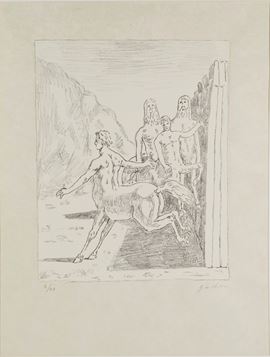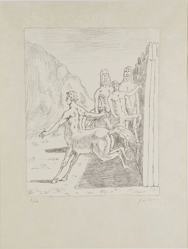 GIORGIO DE CHIRICO (Volos 1888 – Roma 1978) “La famiglia dei Centauri”, 1973. Litografia a colori su carta. Cm 70x50. Opera firmata in basso a destra G. de Chirico. Reca numeri di tiratura in basso a sinistra X/XX. Reca timbro a secco di Alberto Caprini Stampatore Roma in basso a destra. Reca timbro a secco Giorgio de Chirico in basso a sinistra.