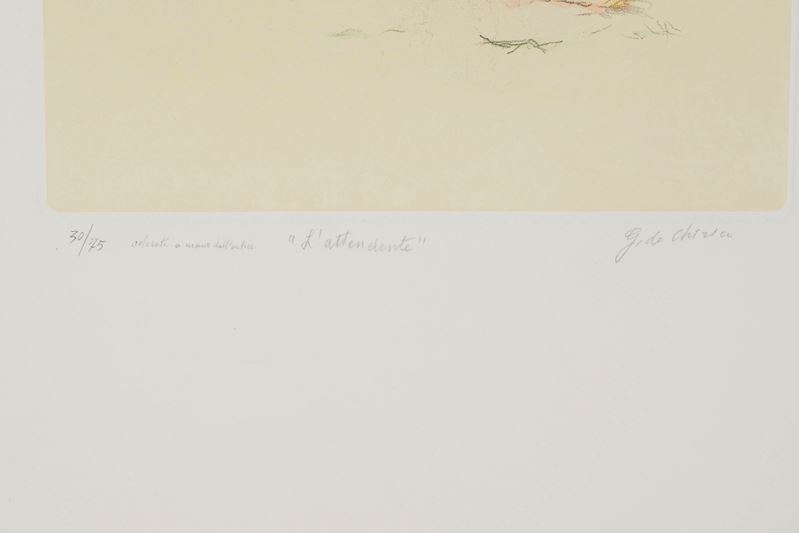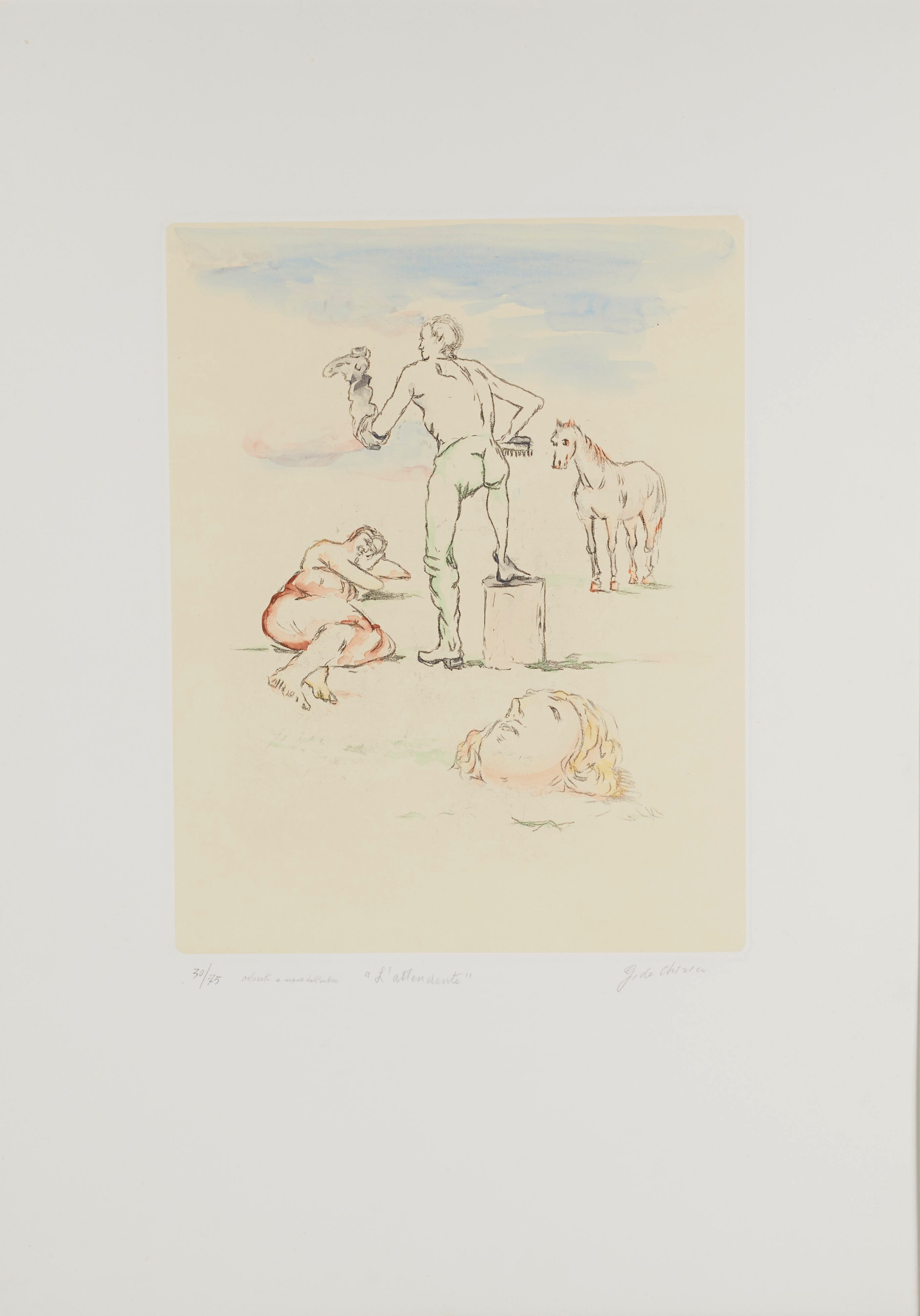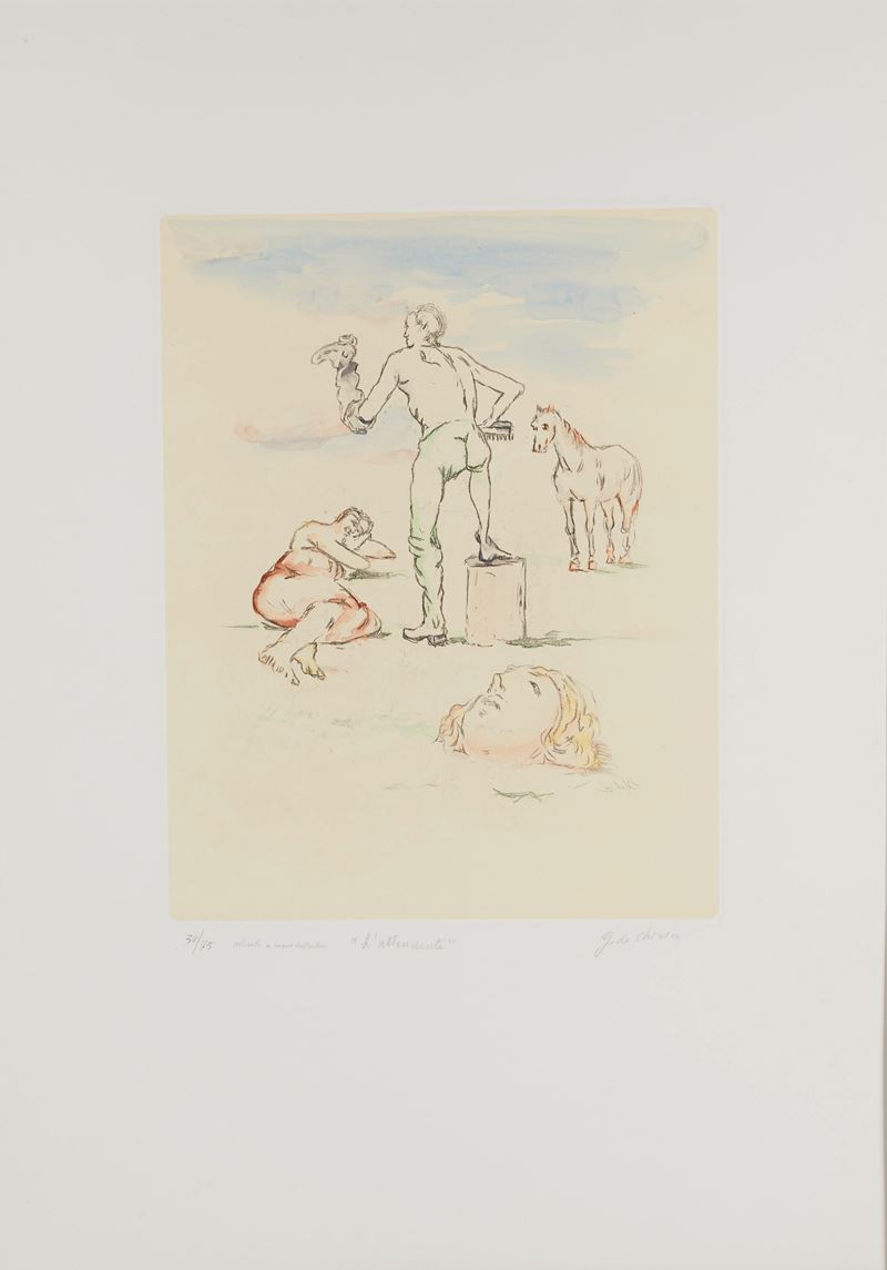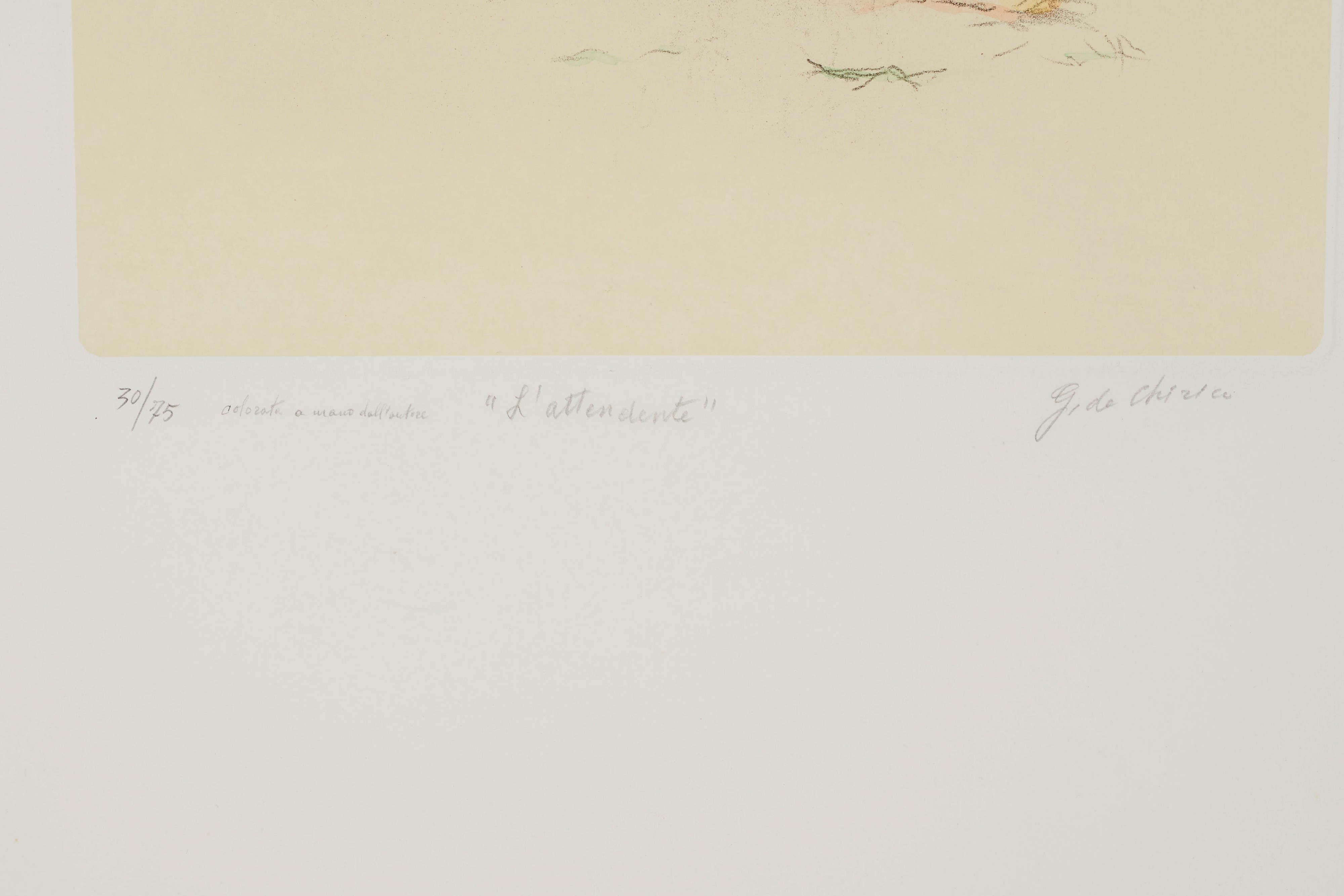 GIORGIO DE CHIRICO (Volos 1888 – Roma 1978) “L'attendente”, 1971. Incisione a vernice molle su carta colorata a a mano. Cm 70x50,5. Opera firmata in basso a destra G. de Chirico. Reca numeri di tiratura in basso a sinistra 30/75. Opera intitolata in basso al centro L'attendente. Reca timbro a secco di Alberto Caprini Stampatore Roma in basso a destra. Reca timbro a secco Giorgio de Chirico in basso a sinistra. Reca scritta colorata a mano in basso a sinistra.