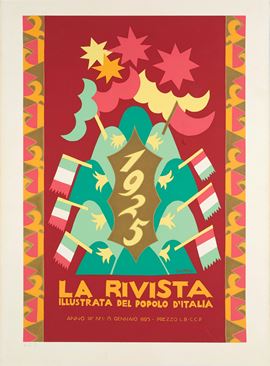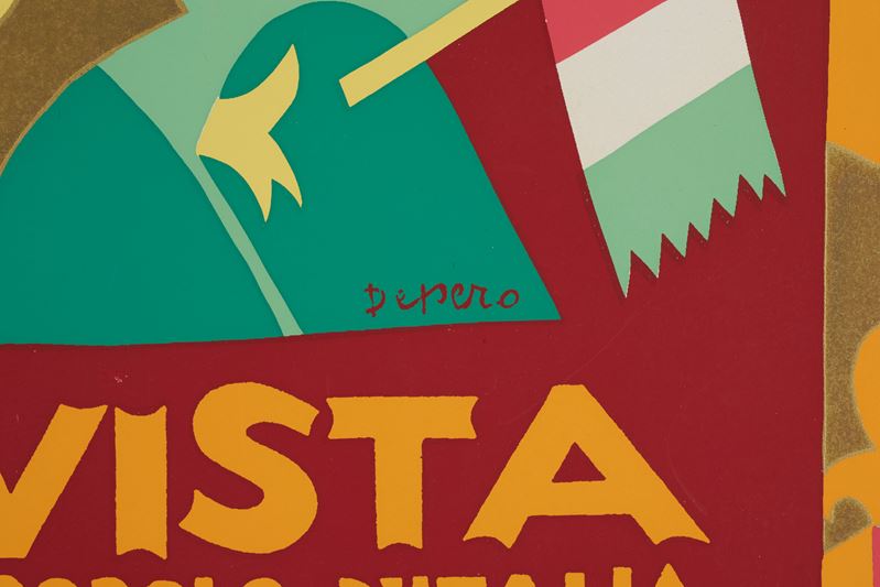 FORTUNATO DE PERO (Fondo 1892 - Rovereto 1960) "La rivista illustrata del popolo d'Italia", 1925. Litografia a colori su carta. Cm 70x50. Opera firmata a stamoa Depero. Reca numeri di tiratura in basso a sinistra p.d.a.