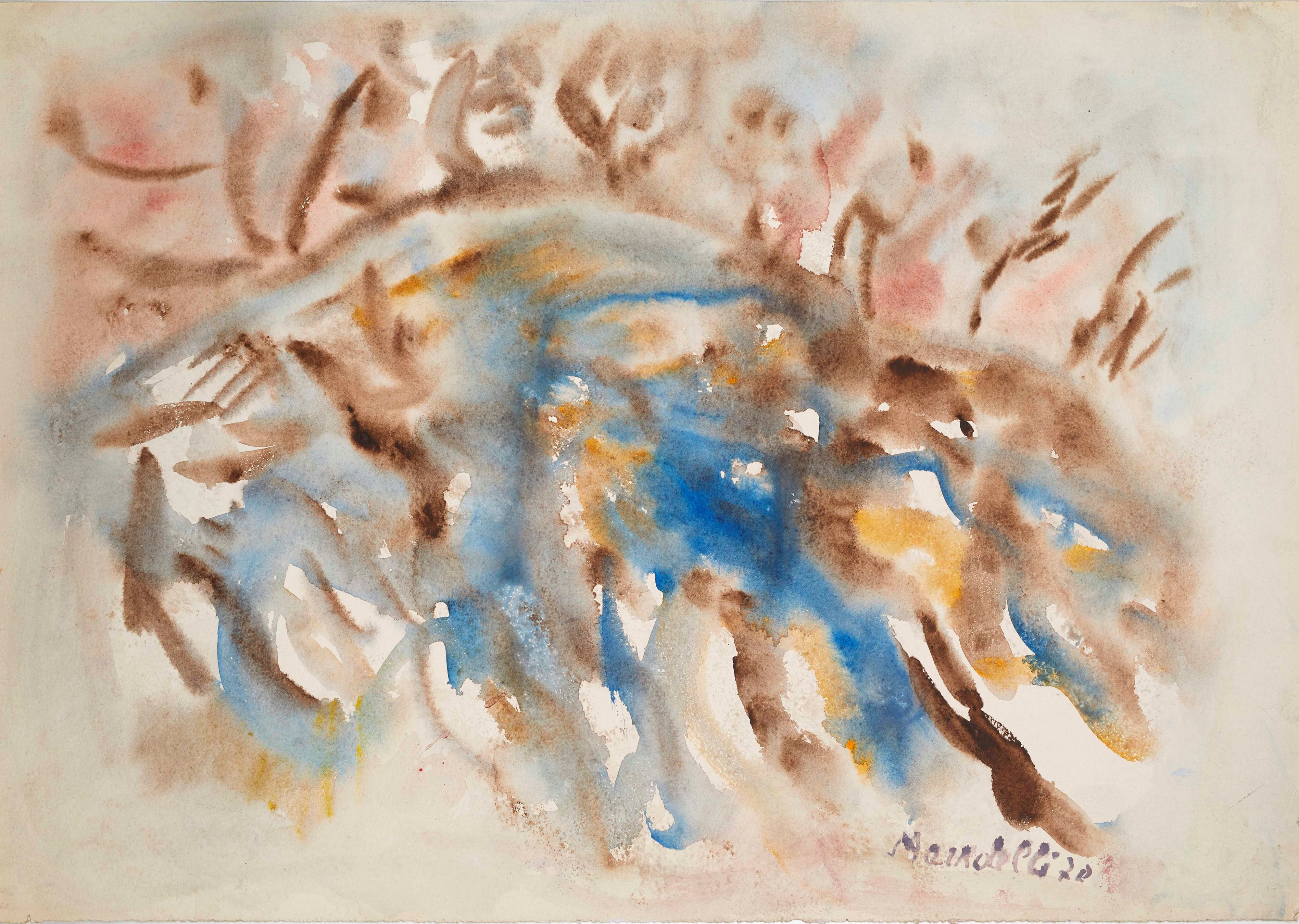POMPILIO MANDELLI (Luzzara 1912 - Bologna 2006) "Pioggia nel paesaggio", 1970. Acquerello su carta. Cm 34,5x49. Opera firmata e datata in basso a destra Mandelli '70. Opera intitolata e datata al retro Pioggia nel paesaggio 1970.