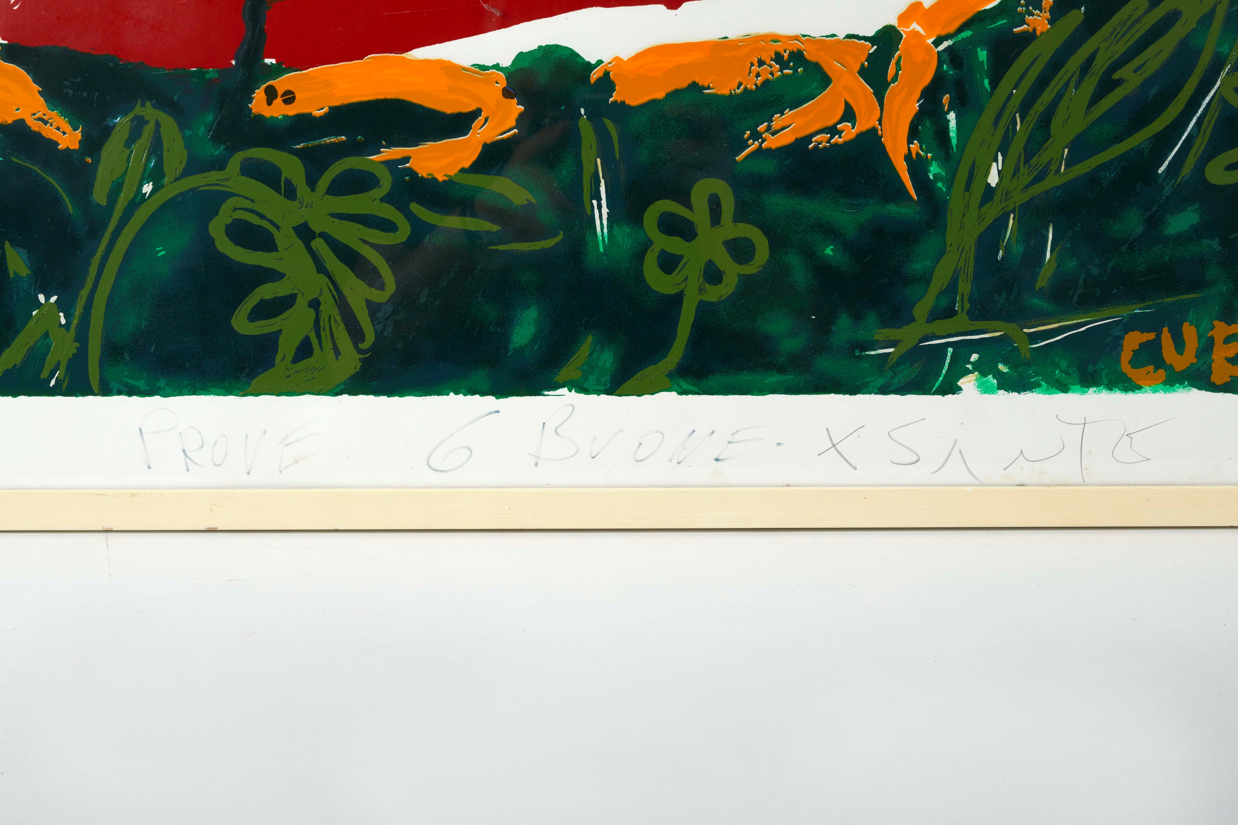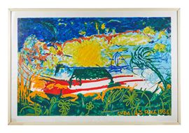 MARIO SCHIFANO (Homs 1934 - Roma 1998) "Cuba (H's place 1954)". Serigrafia a colori su carta. Cm 80x120. Opera firmata in basso a destra Schifano. Reca scritta al centro prove 6 buone per Sante.