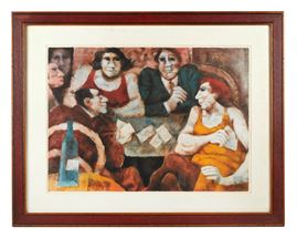 REMO SQUILLANTINI (Stia 1920 - Firenze 1996) "Giocatori di carte". Litografia a colori su carta. Cm 50x70. Opera firmata in basso a destra Squillantini. Reca numeri di tiratura in basso a sinistra p.d.a.