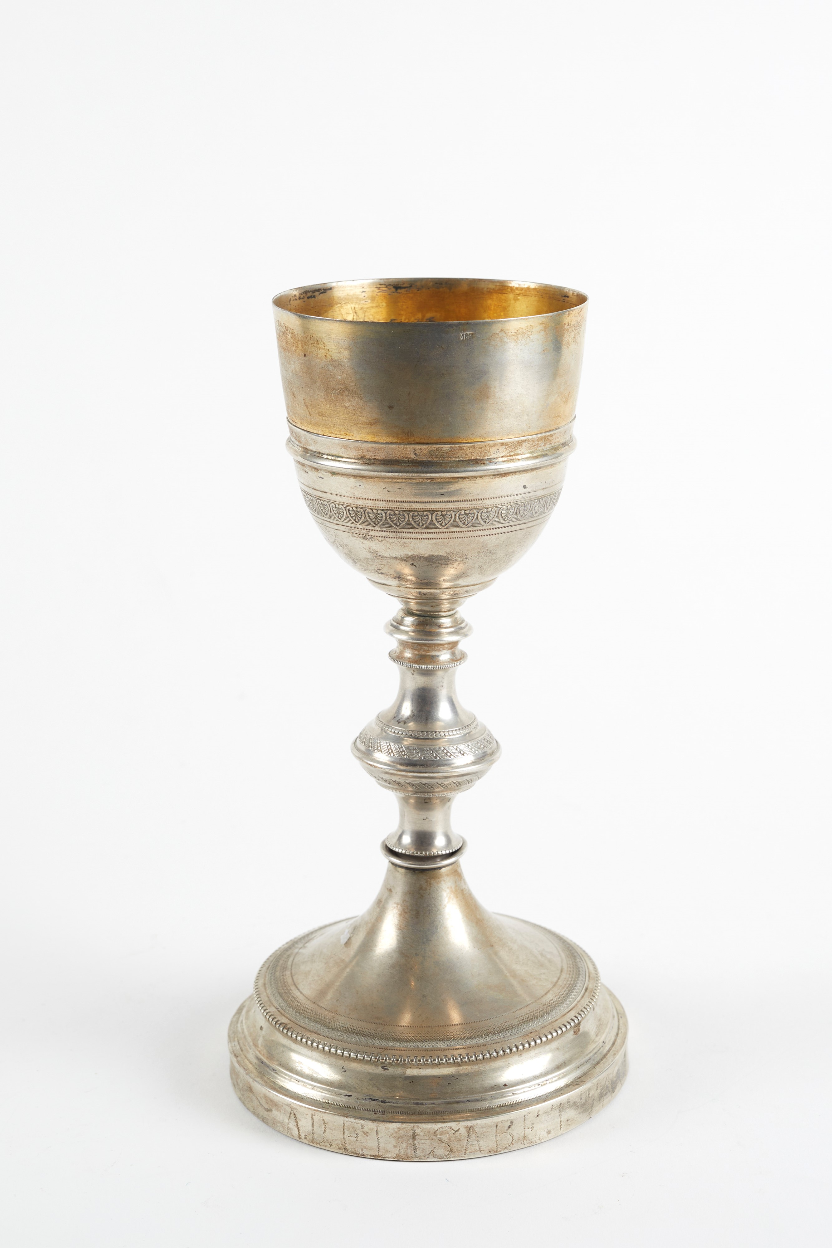 Calice in argento cesellato. Italia, 1935. Alla base reca incisione con dedica. Cm 22x11,5ø. Peso: 272 gr.