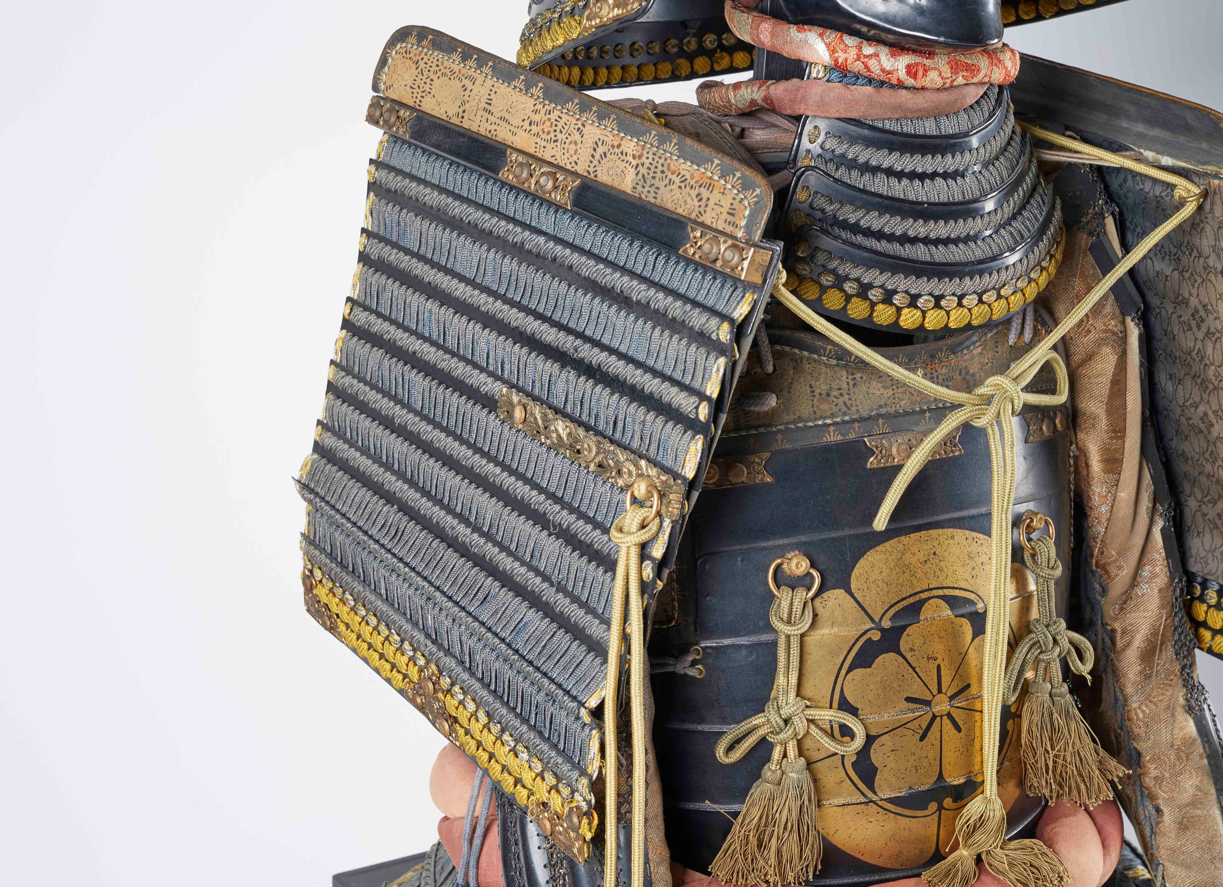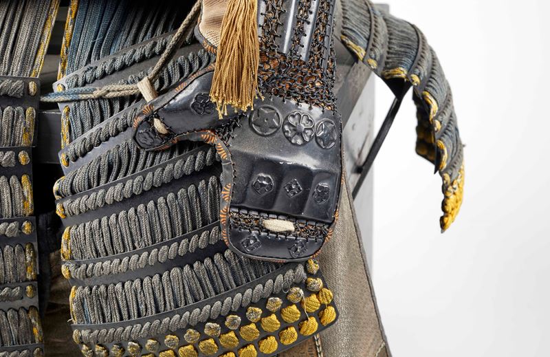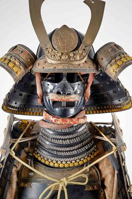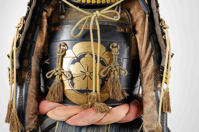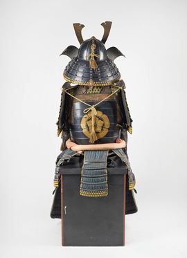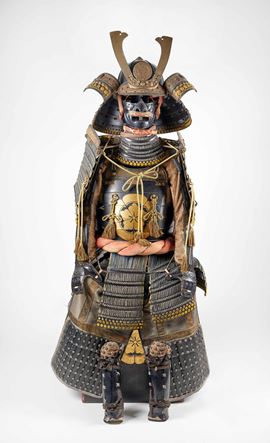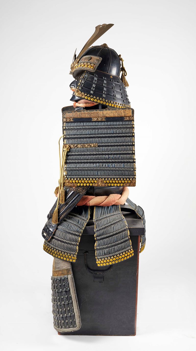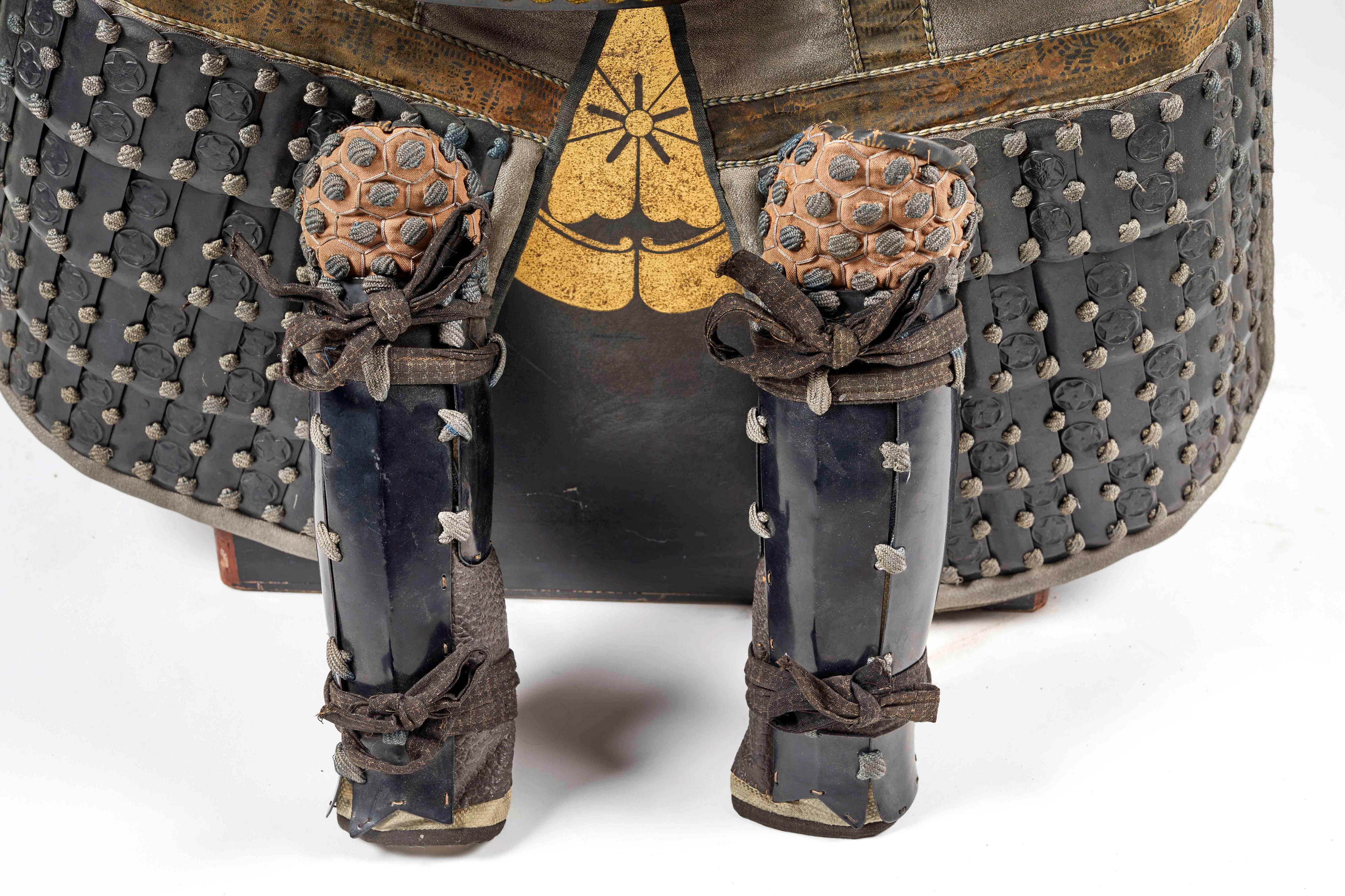 Corazza di Samurai completa di baule con blasone (fiore di melone). Appartenente alla famiglia O-Ta di Ten-Do, di Kashiwa-bara di Shiba-Mura e di Yagi-Moto. 1830 circa. Cm 156x48x34,5. Opera accompagnata da autentica su fotografia e da certificato di autenticità con perizia firmato da Paolo Morigi, in data 26 marzo 1984.