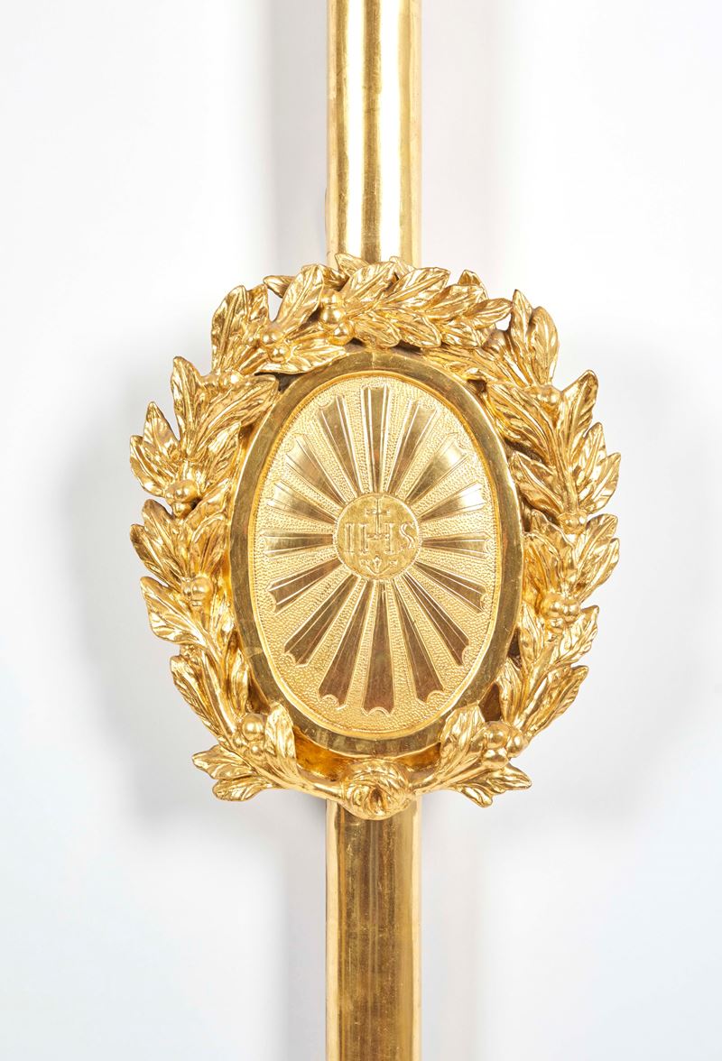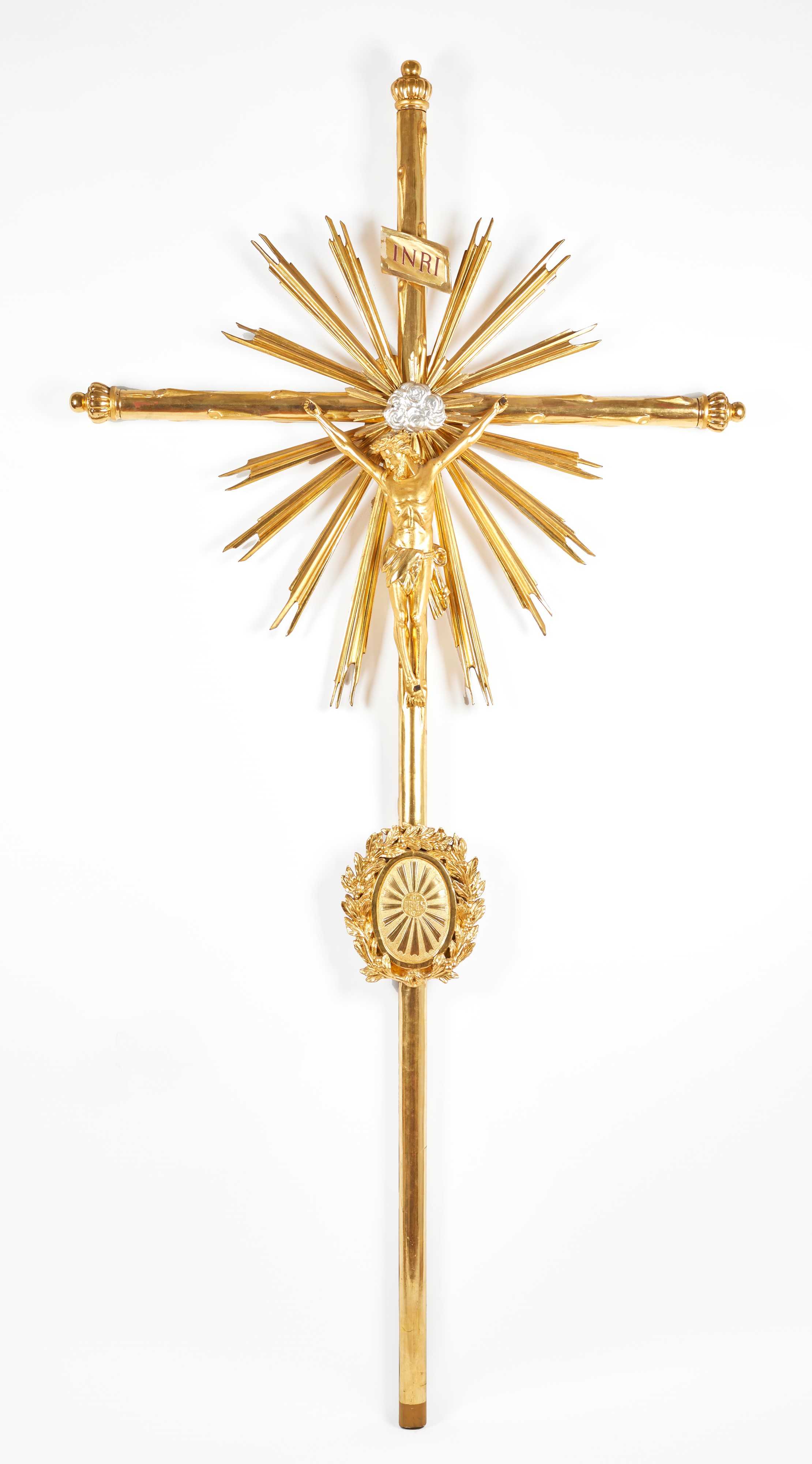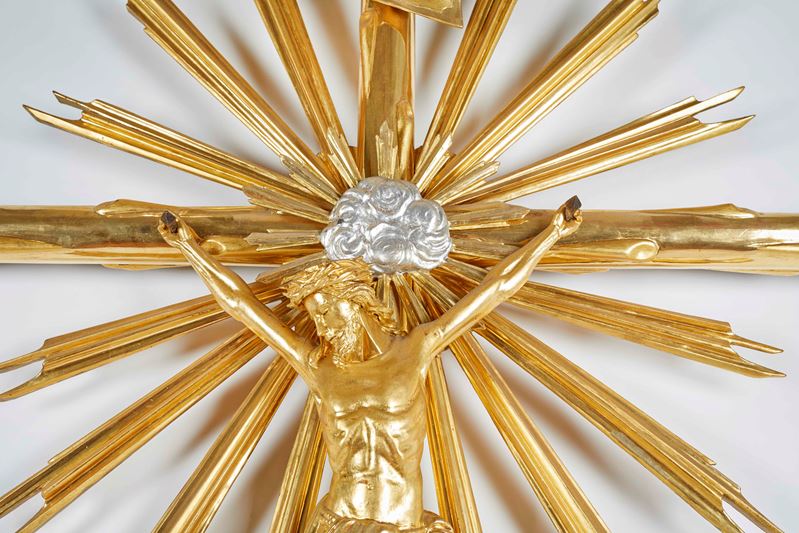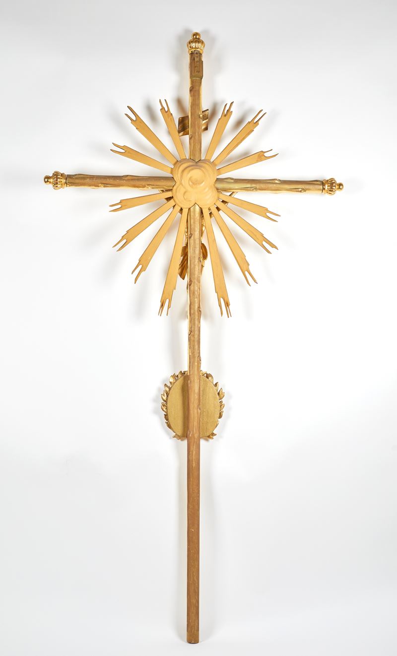 Grande crocifisso da processione in legno dorato e argentato. XX secolo. Cm 240x120x15.