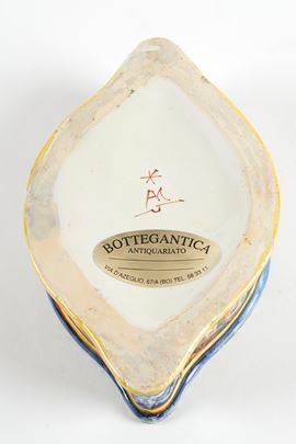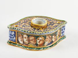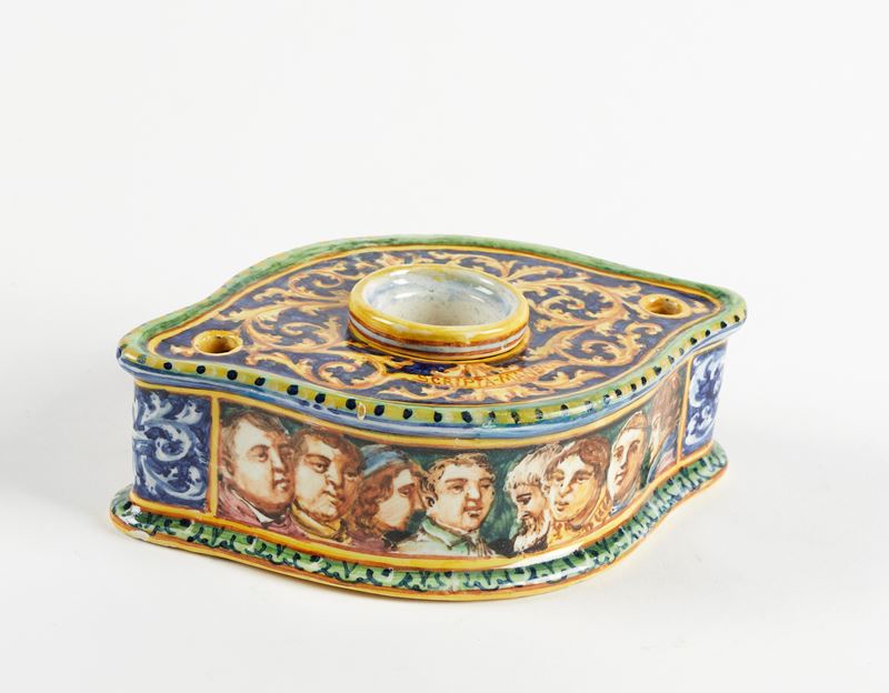 MANIFATTURA MINGHETTI Calamaio con boccetta per l'inchiostro estraibile in ceramica policroma, decorato con motivi fitomorfi sulla parte superiore e con teste maschili di personaggi rinascimentali sui lati. 1900-1910. Cm 5x17x11. Al retro reca marchio AM. (lievi difetti) Accompagnato da certificato di autenticità di Bottegantica, Bologna.