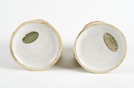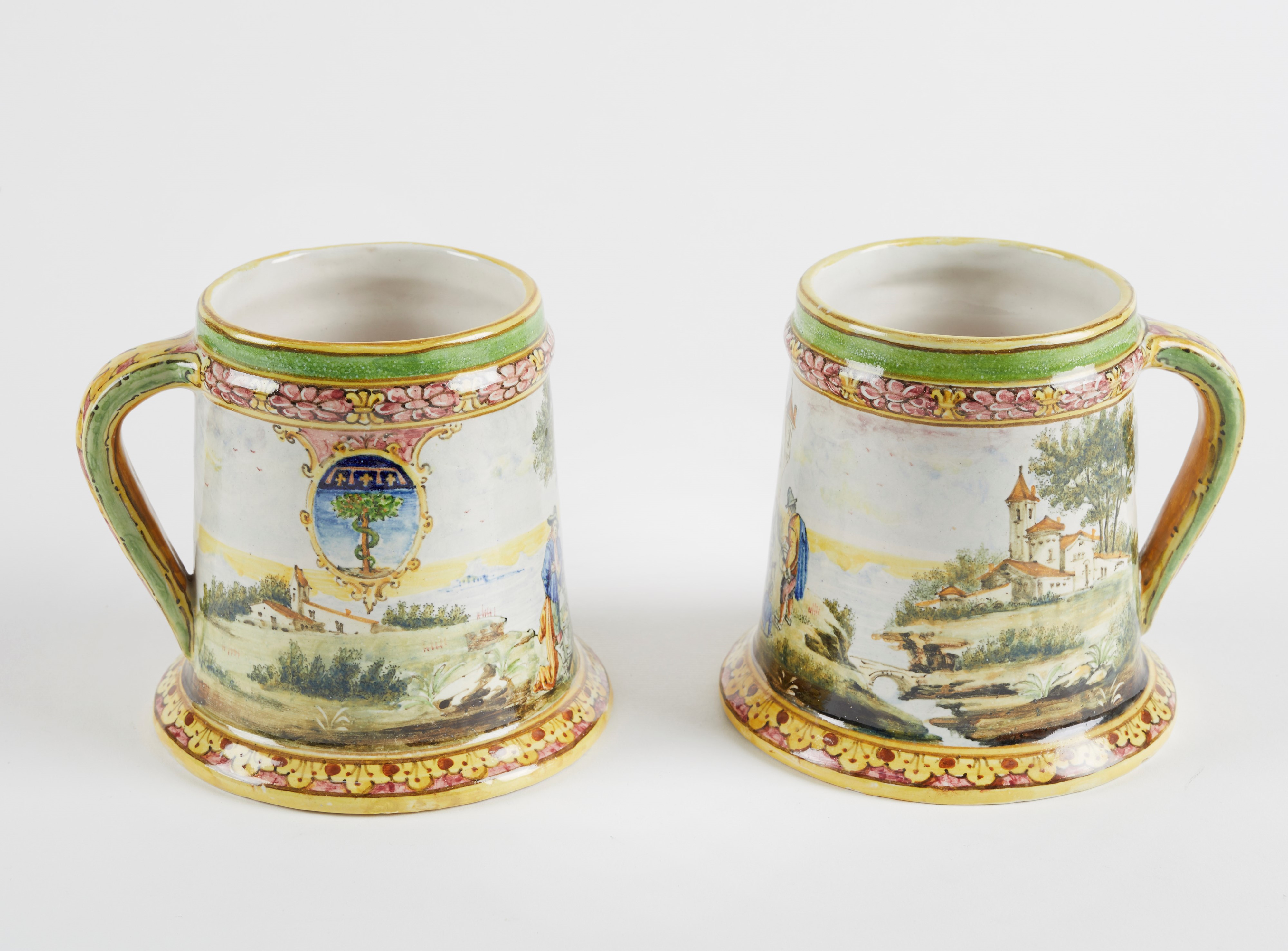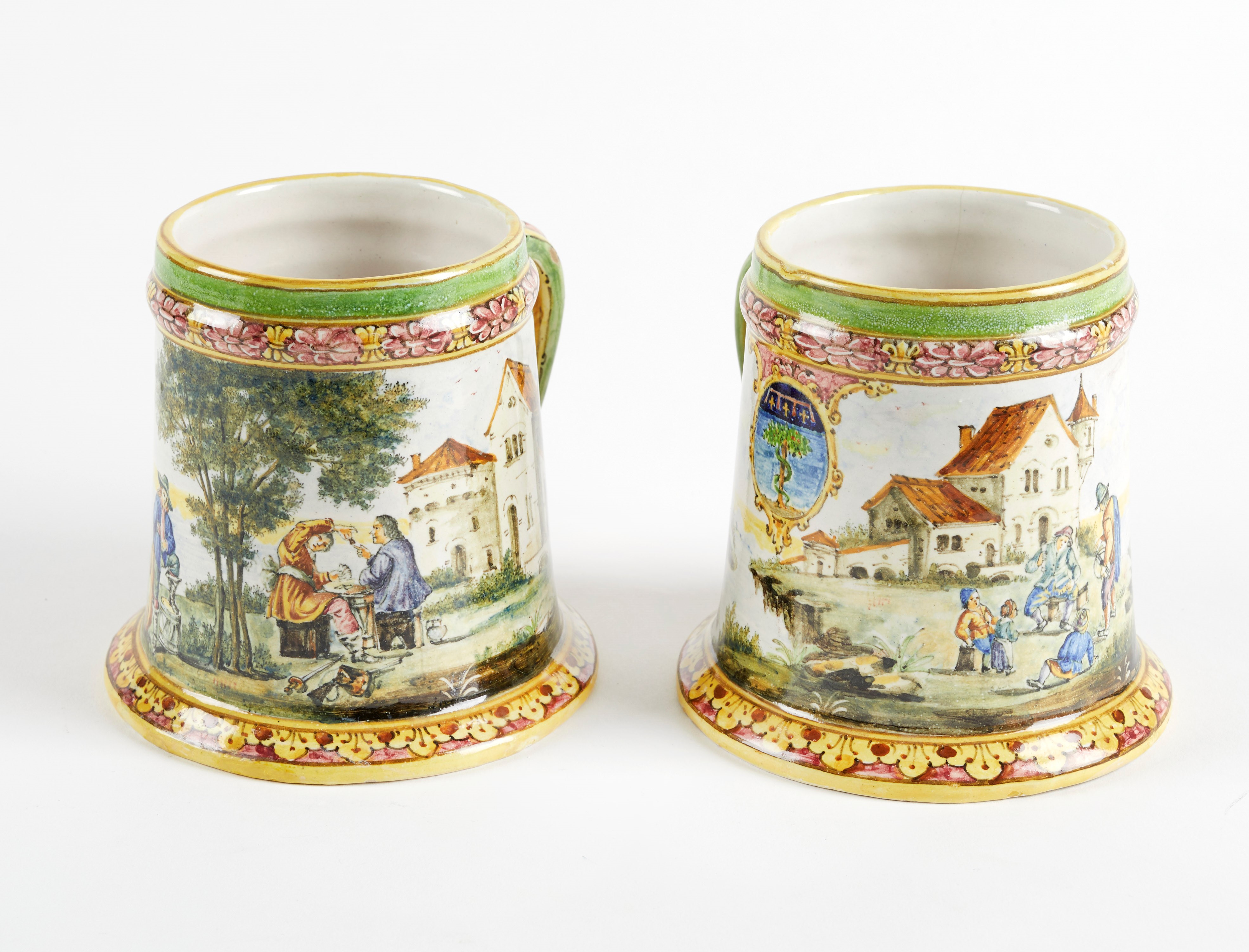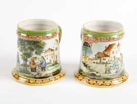 MANIFATTURA MINGHETTI Coppia di boccali in ceramica policroma, decorati con scene campestri. 1890-1900. Cm 12,5x12,5x13. Al retro recano marchio AM. (lievi difetti)