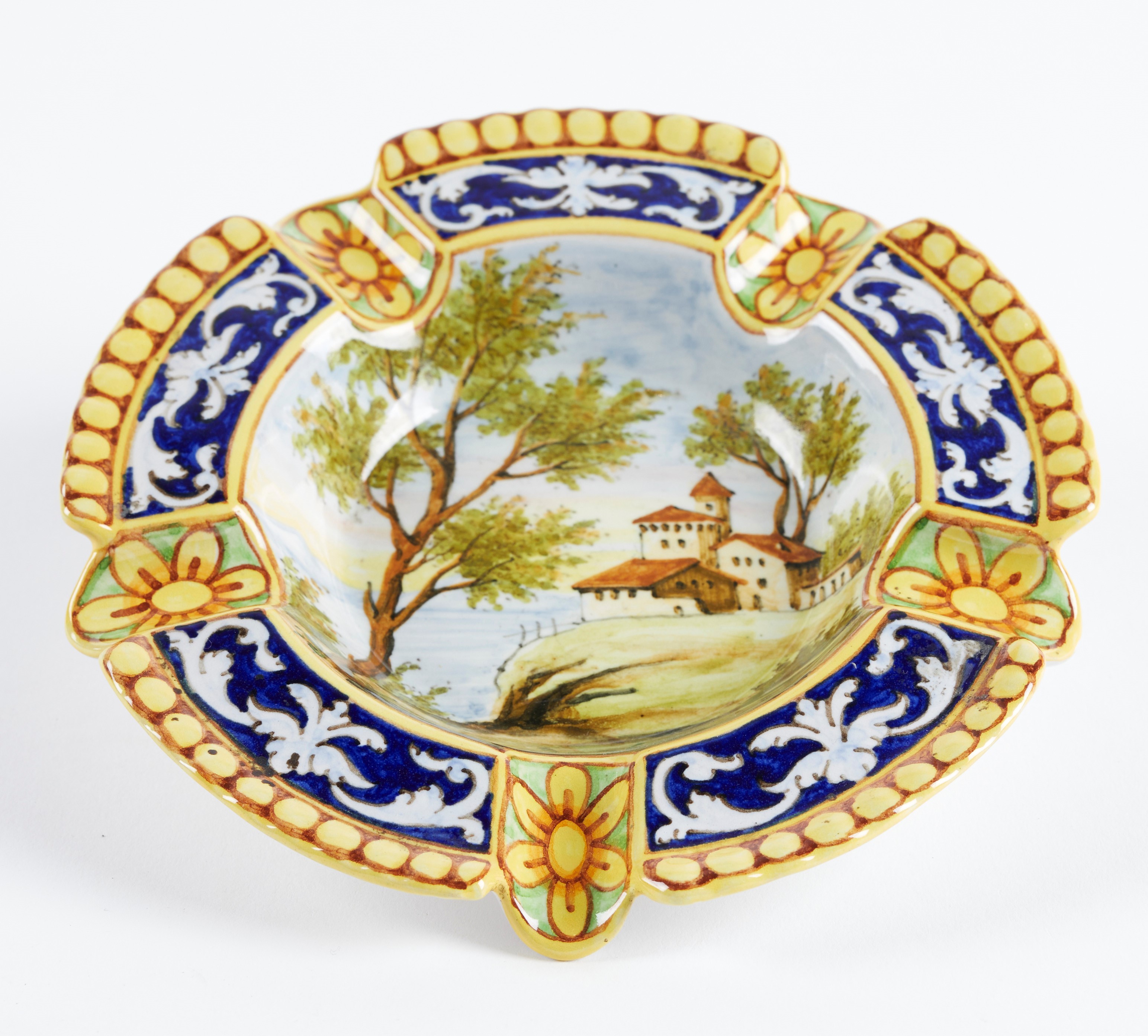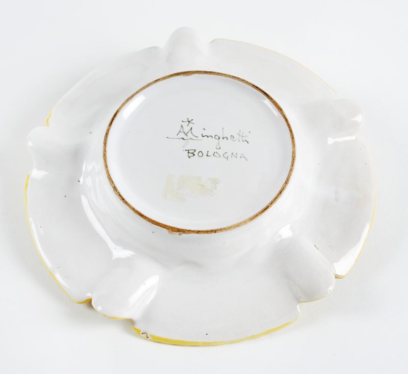 MANIFATTURA MINGHETTI Posacenere in ceramica policroma decorato con paesaggio e motivi fitomorfi sul bordo. 1910-1920. Cm 3x16. Al retro reca marchio AMinghetti Bologna. (lievi difetti) Accompagnato da certificato di autenticità di Bottegantica, Bologna.