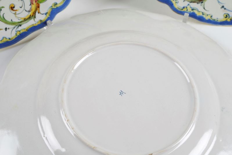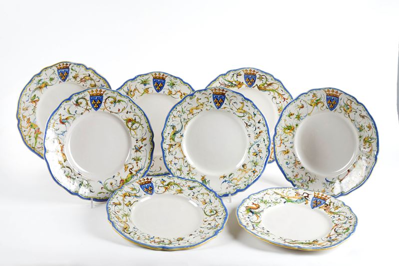 MANIFATTURA ANGELO MINGHETTI Serie di 8 piatti in ceramica policroma decorata a grottesche sul bordo e stemma gentilizio "Duca di Montrensier". 1888. Cm 25,5 Ø. Al retro recano marchio AM. Accompagnati da certificato di autenticità di Bottegantica, Bologna.