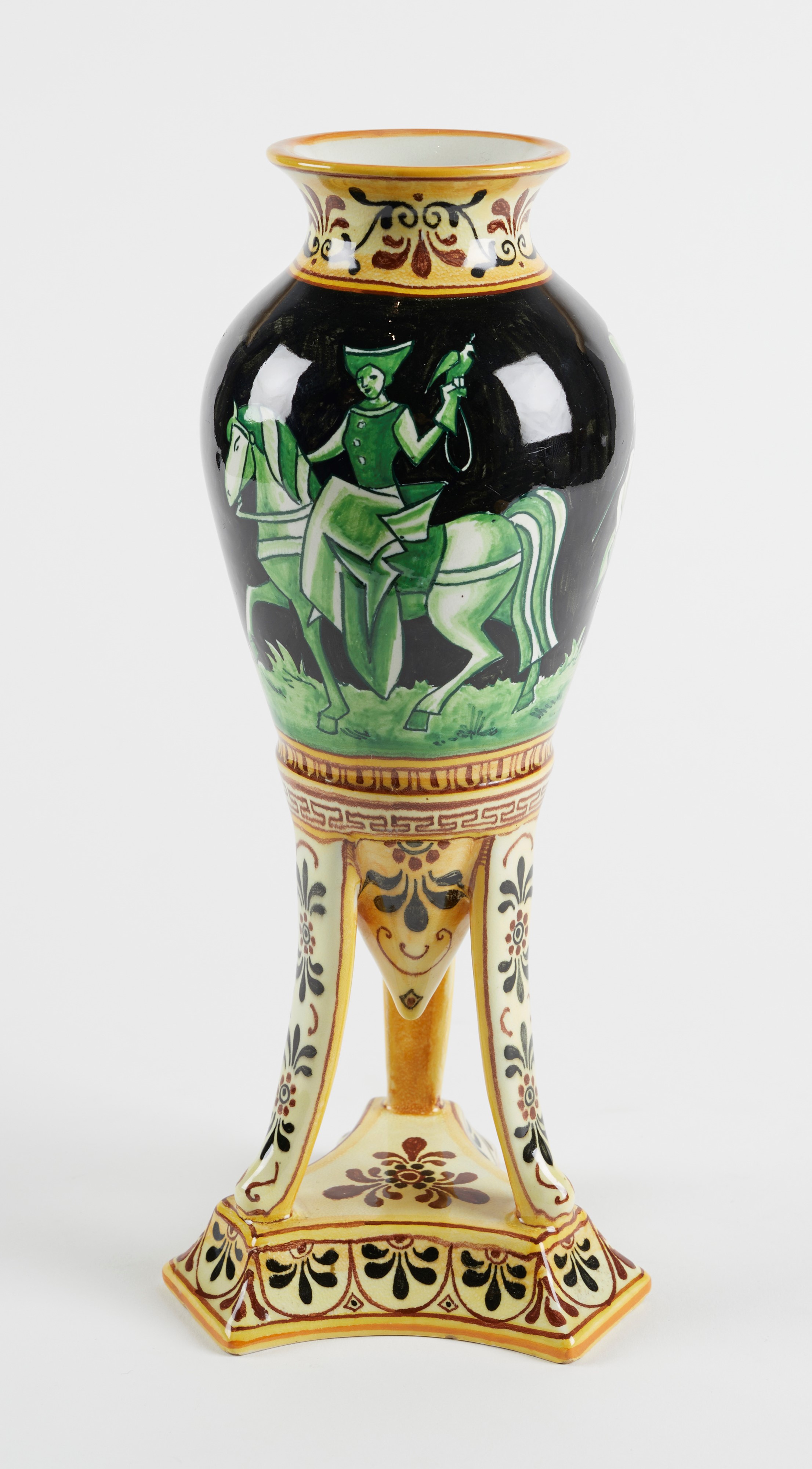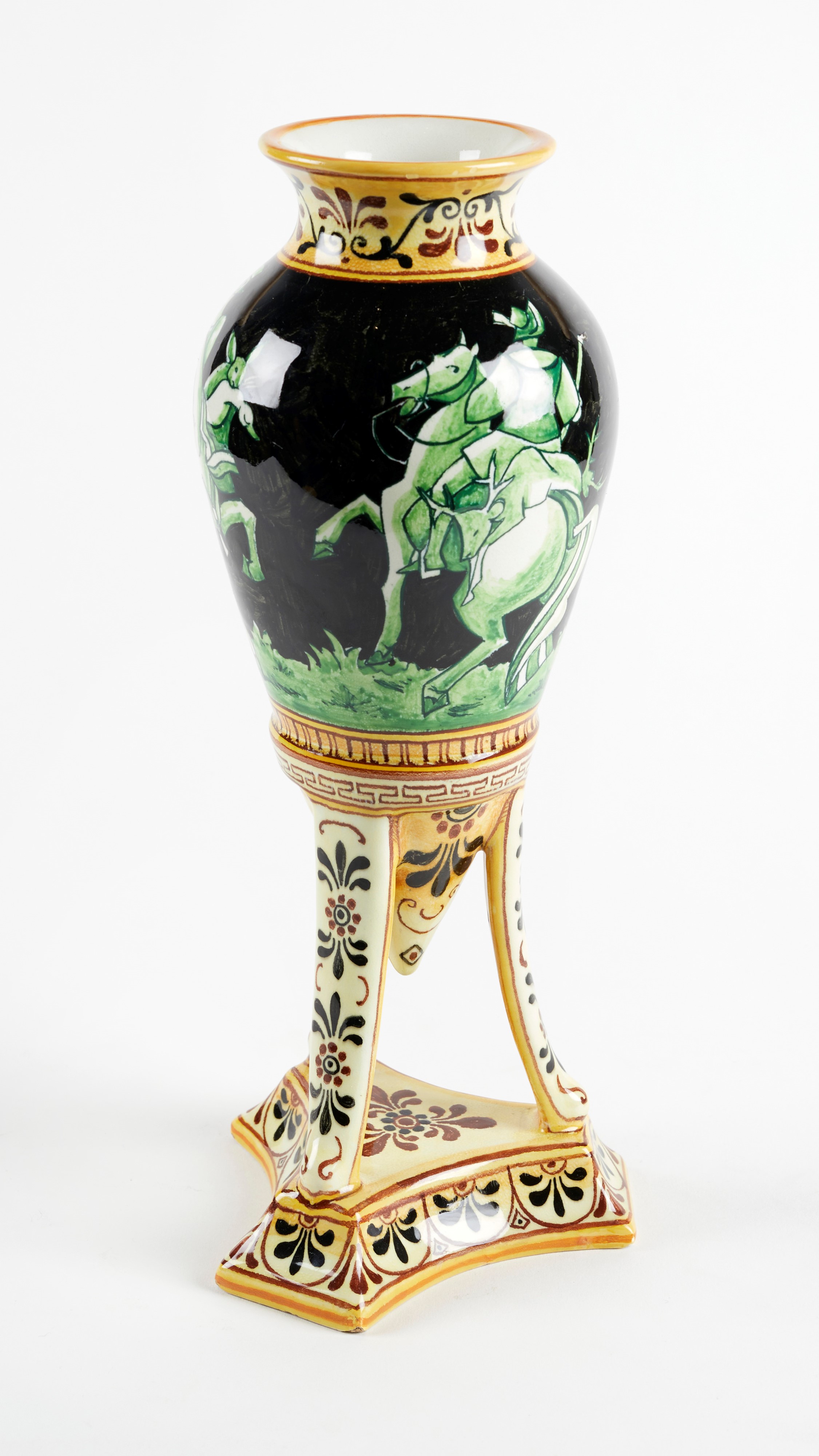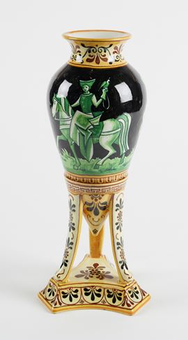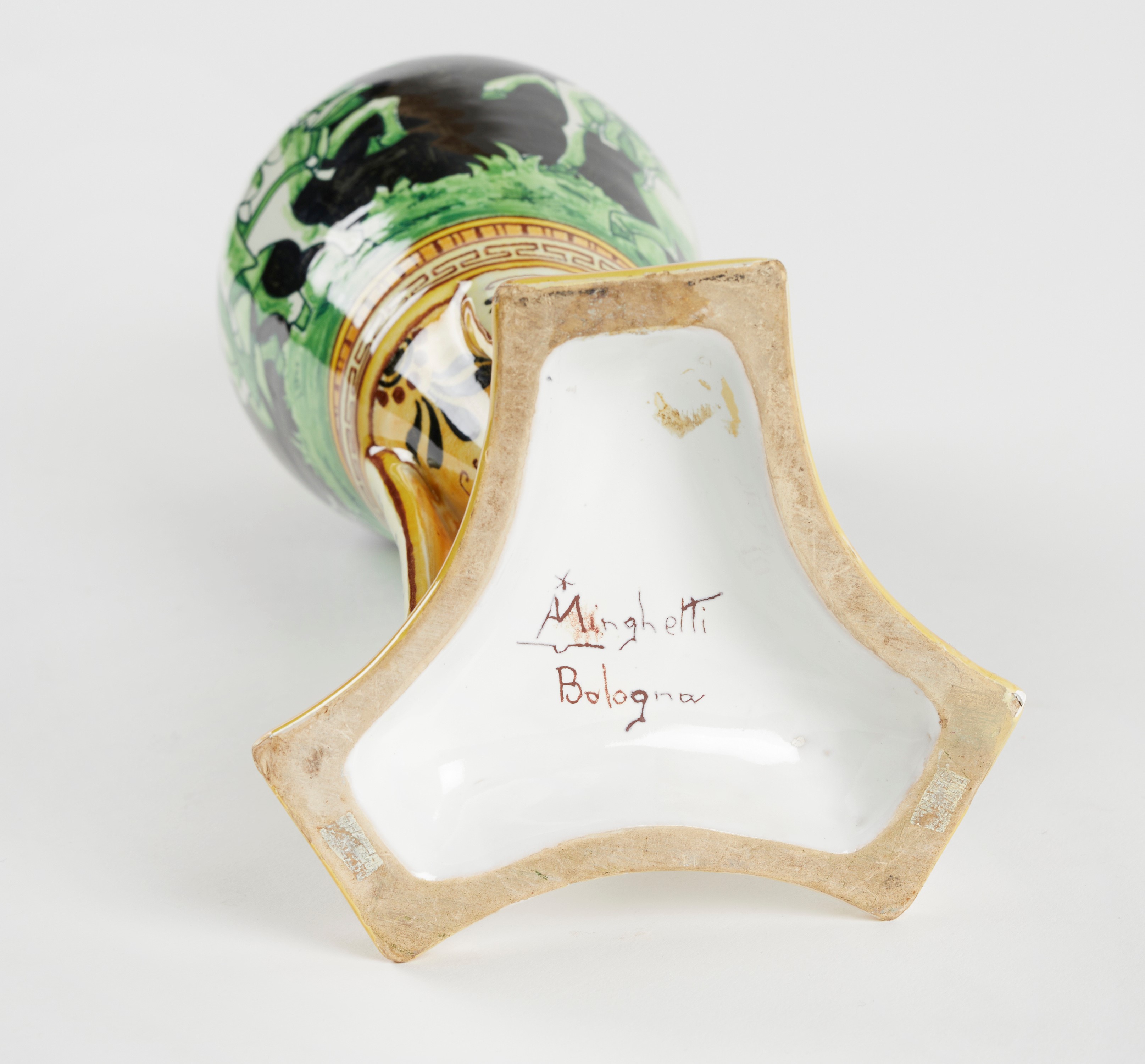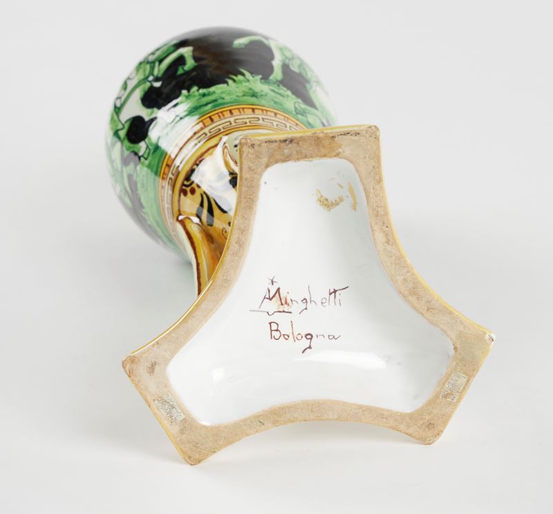 MANIFATTURA MINGHETTI Vaso anfora in ceramica policroma, su base a treppiede, decorato con figure a cavallo sulla pancia e motivi fitomorfi sul collo e la base. 1900 - 1910. Cm 29x12x12. Al retro reca marchio AMinghetti Bologna. (lievi difetti) Accompagnato da certificato di autenticità di Bottegantica, Bologna.