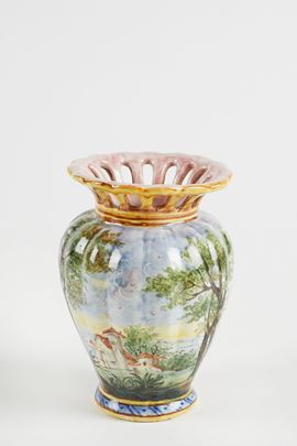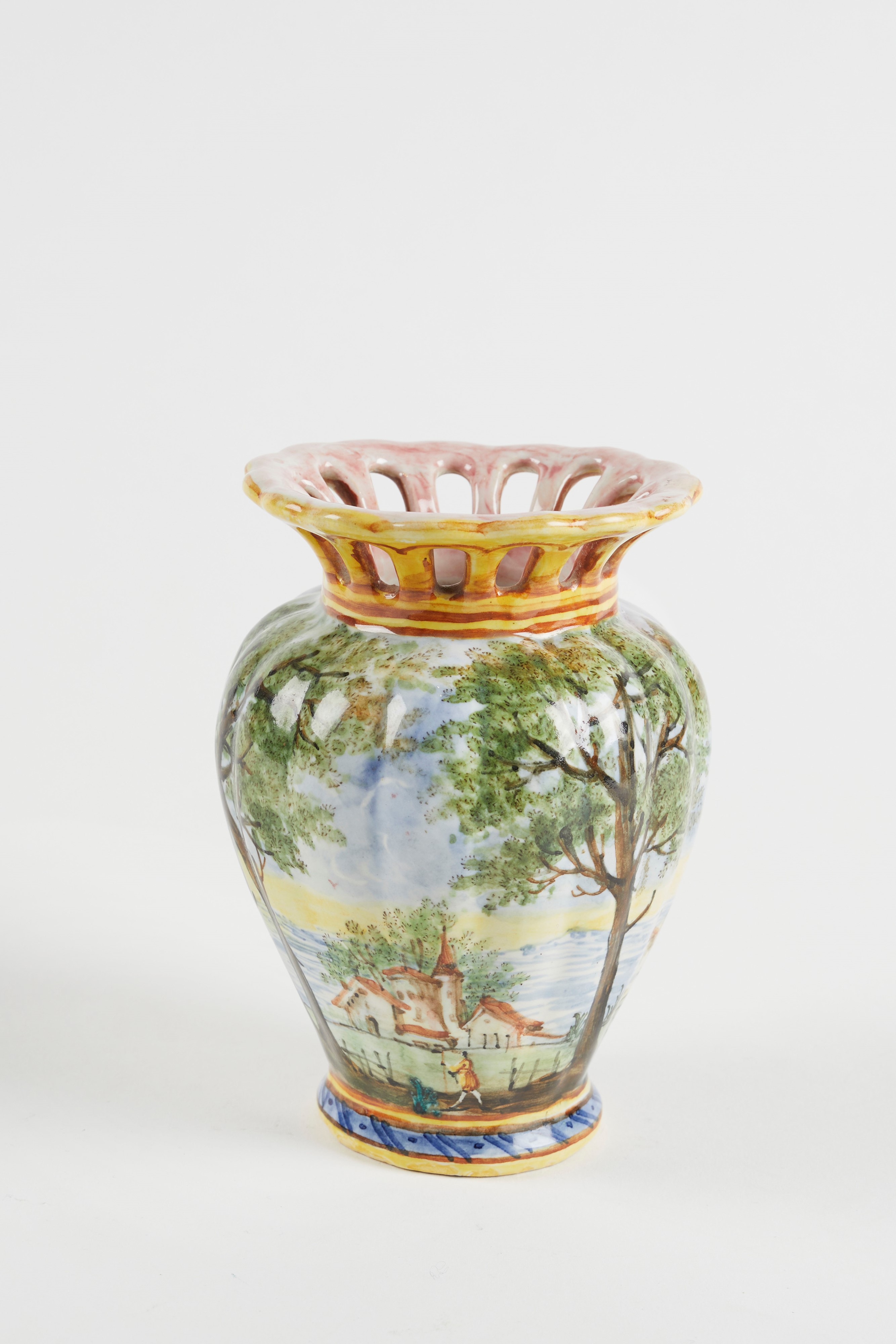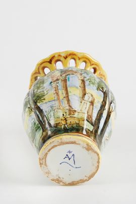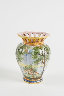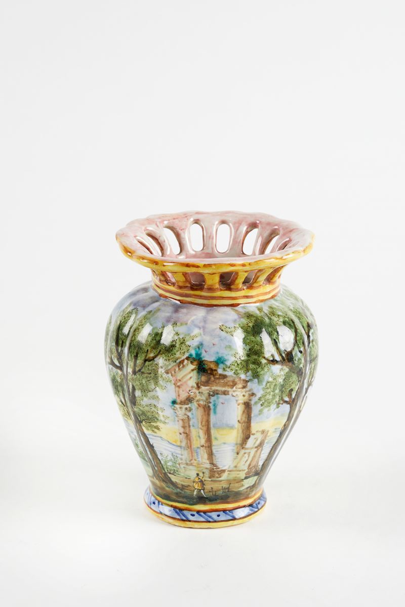 MANIFATTURA MINGHETTI Vaso in ceramica policroma con collo a traforo, decorato con paesaggio e vedute di rovine e villaggi. XX secolo. Cm 14,5x11x11. Al retro reca marchio AM. (lievi difetti)