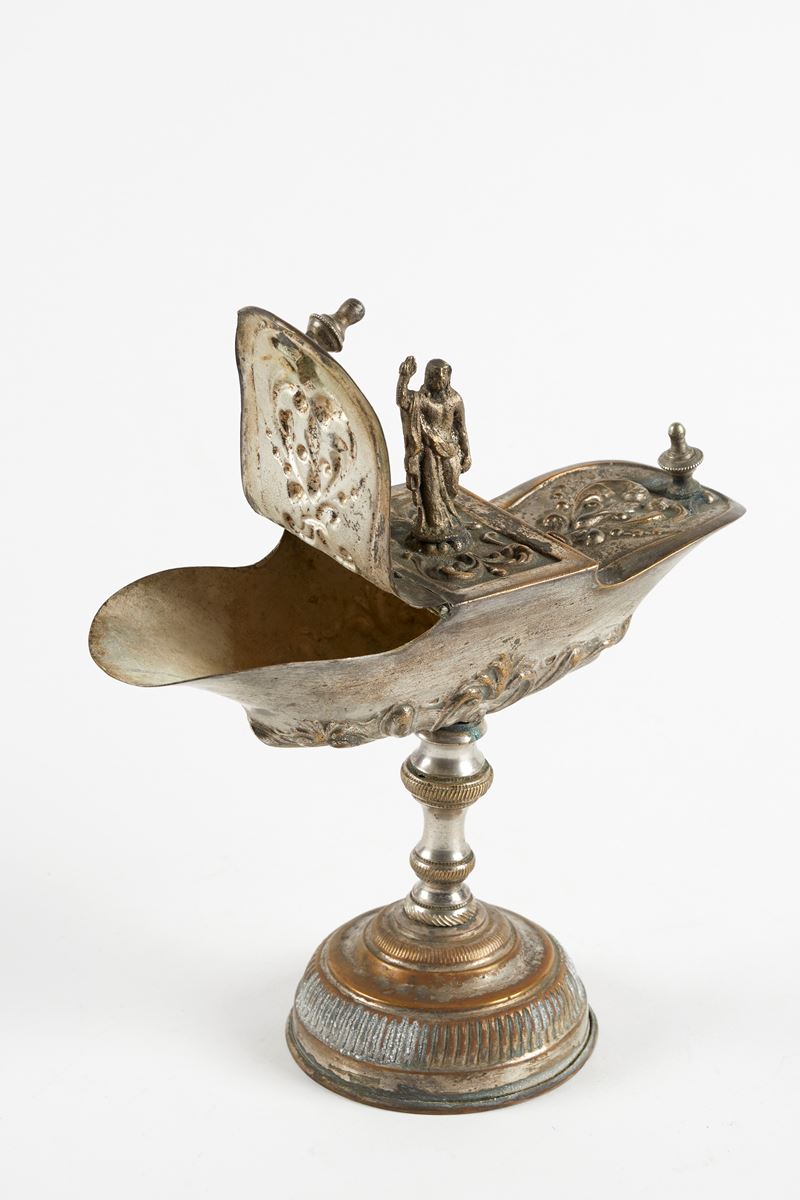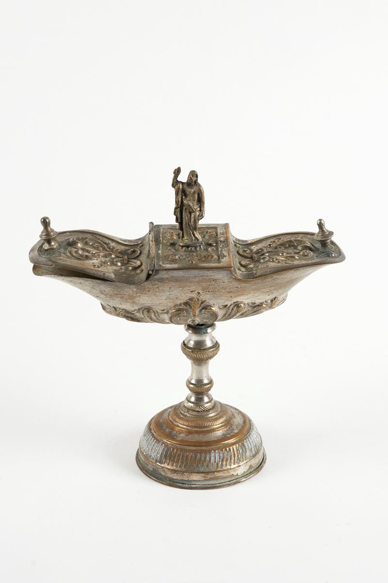 Navicella portaincenso in metallo argentato con lavorazione a sbalzo e a cesellatura. Presenta una base decorata, un fusto e un corpo a forma di barca con coperchi incernierati. Sul coperchio è presente un'immagine di Cristo. Italia, XIX secolo. Cm 19,5x19,5x8,5.