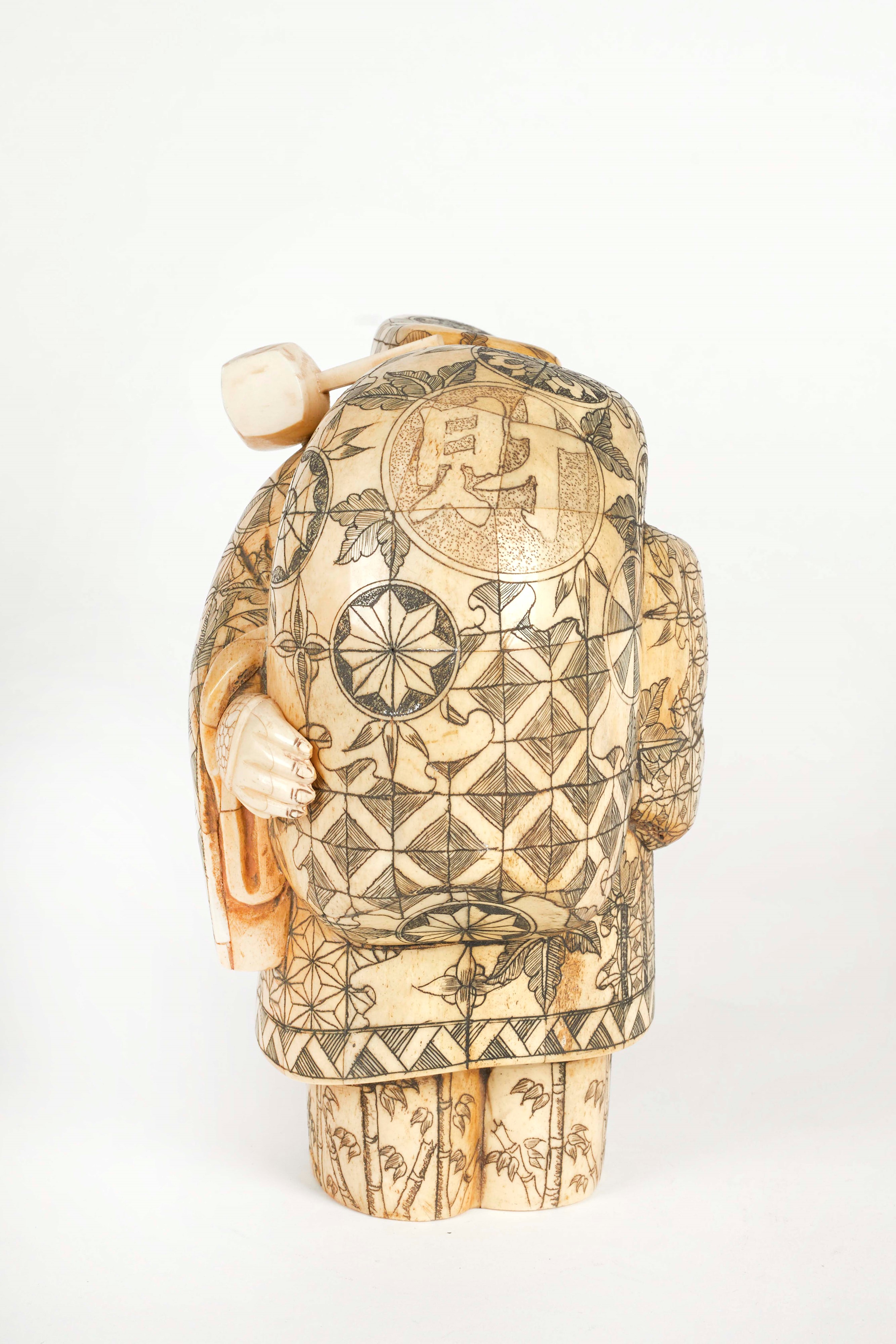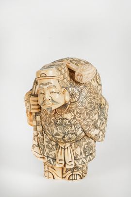 Okimono in avorio di elefante raffigurante Daikokuten, una delle Sette Divinità della Fortuna. Giappone, periodo Meiji (1868-1912), fine del XIX secolo. Cm 21×13×16,5. Corredata di certificazione CITES.