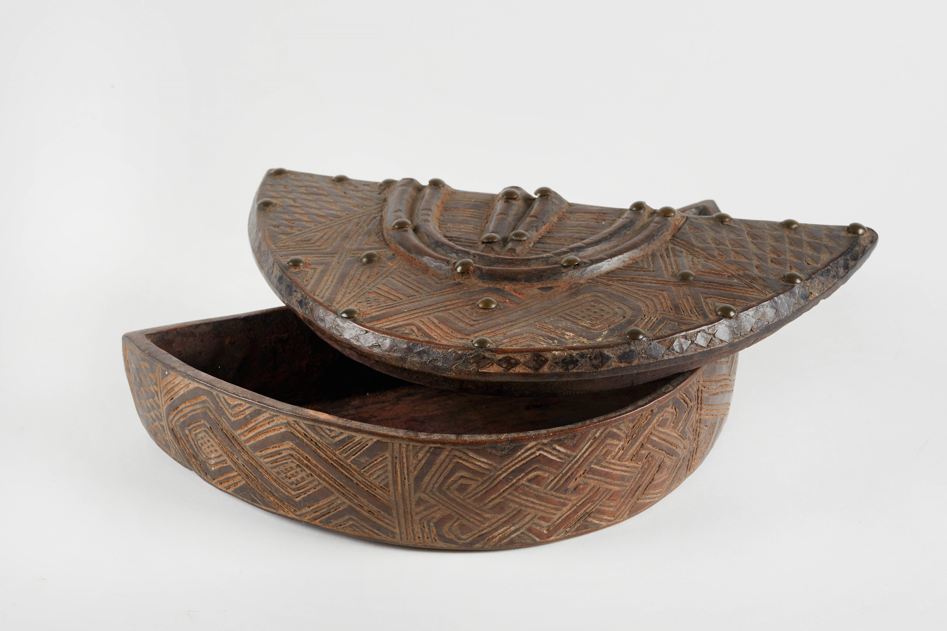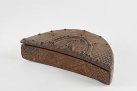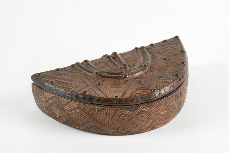 Scatola per cosmesi maschile destinata a contenere rasoi e tukula (colorante rosso). In legno a patina brillante e tracce di tukula. Bakuba, regione del Kasai, Zaire. Cm 27x7 cm. Decorazione a motivi geometrici, gli stessi usati nei famosi velluti Bakuba. Due piccole corna scolpite in rilievo, indicano che la scatola apparteneva ad un notabile. Le borchie sono di importazione europea. Opera accompagnata da autentica su fotografia e certificato di autenticità con perizia firmato da Paolo Morigi, in data 15/02/1986.