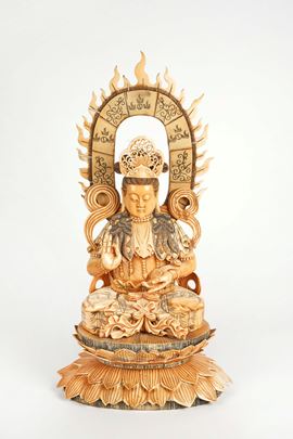Scultura in avorio di elefante raffigurante Guanyin, divinità della misericordia. Cina, dinastia Qing (1644-1912). Tardo XIX – inizi XX secolo. Cm 51×27,5×17,5. Corredata di certificazione CITES.