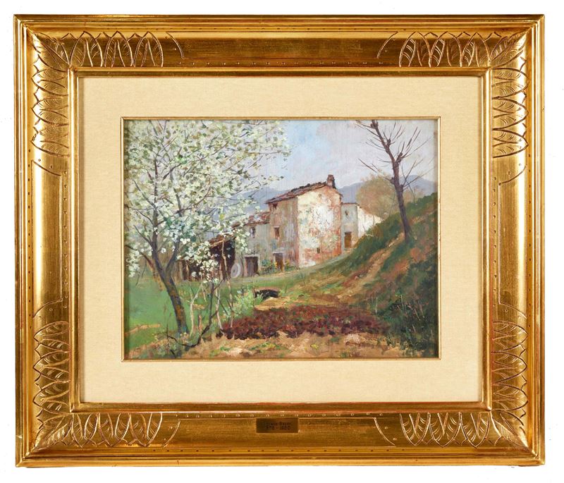 GIOVANNI SECCHI (Bologna 1876 - Darfo 1950) "Casolare in primavera". Olio su tavola. Cm 27x35. Al retro reca doppio timbro della Galleria d'Arte Il Gioiello di Bologna.