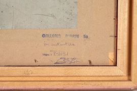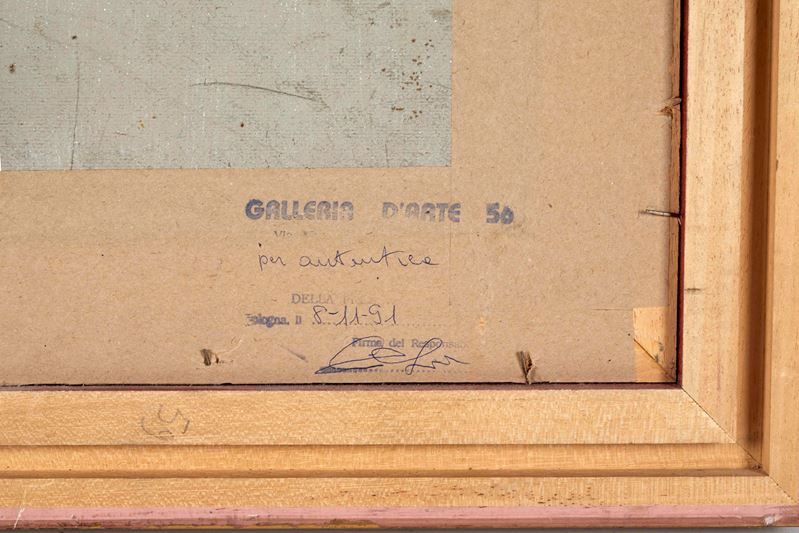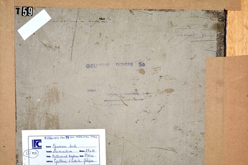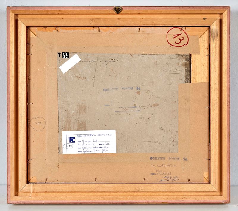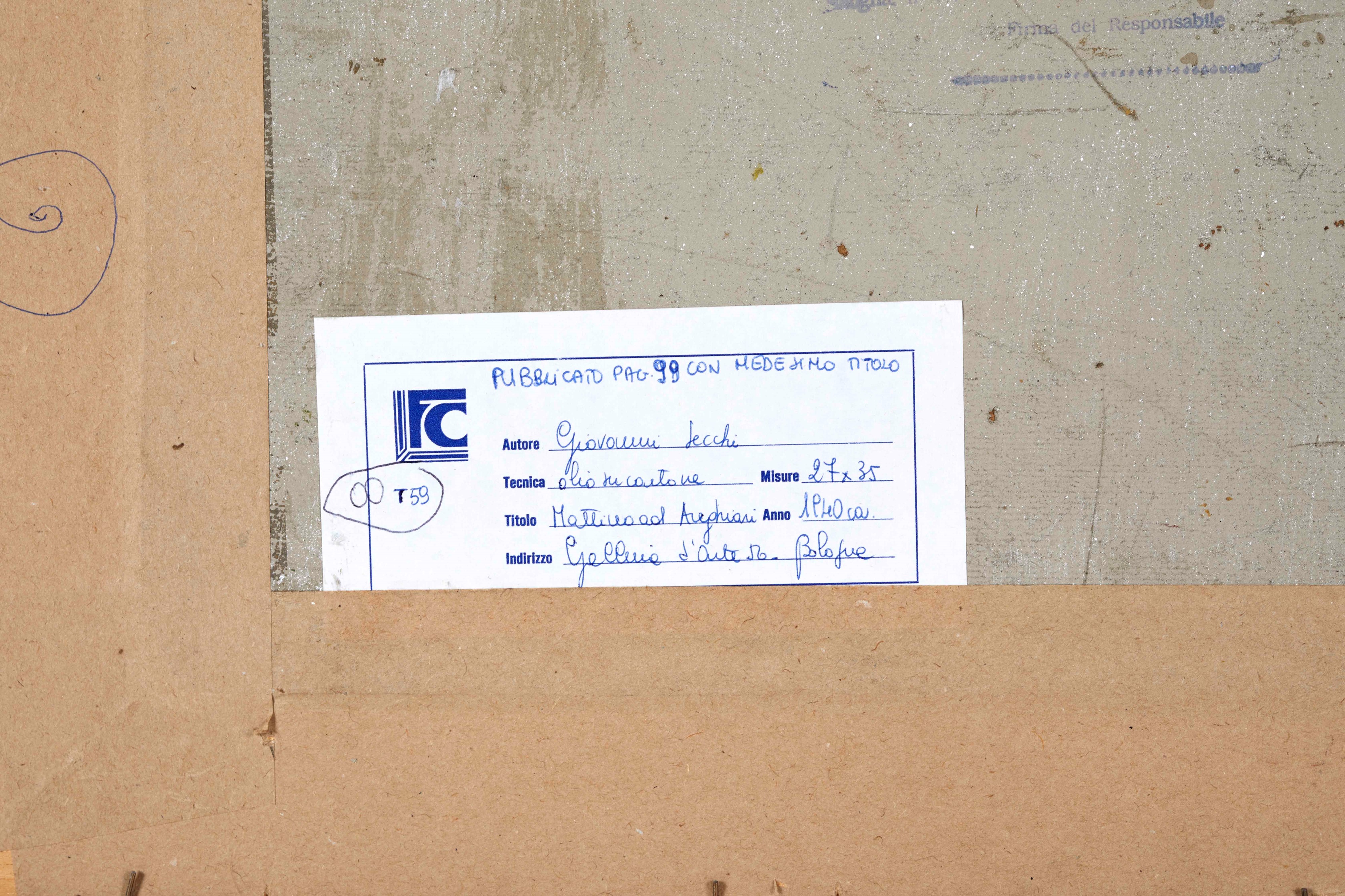 GIOVANNI SECCHI (Bologna 1876 - Darfo 1950) "Mattino ad Anghiari", 1940. Olio su cartone. Cm 27x35. Opera firmata in basso a destra G. Secchi. Al retro opera firmata e intitolata Giovanni Secchi, Mattino ad Anghiari. Al retro reca timbro con firma per autentica della Galleria d'Arte 56, Bologna. Al retro reca etichetta di Galleria non identificata. Opera accompagnata da certificato di autenticità della Galleria d'Arte 56, datato 8/11/1991.