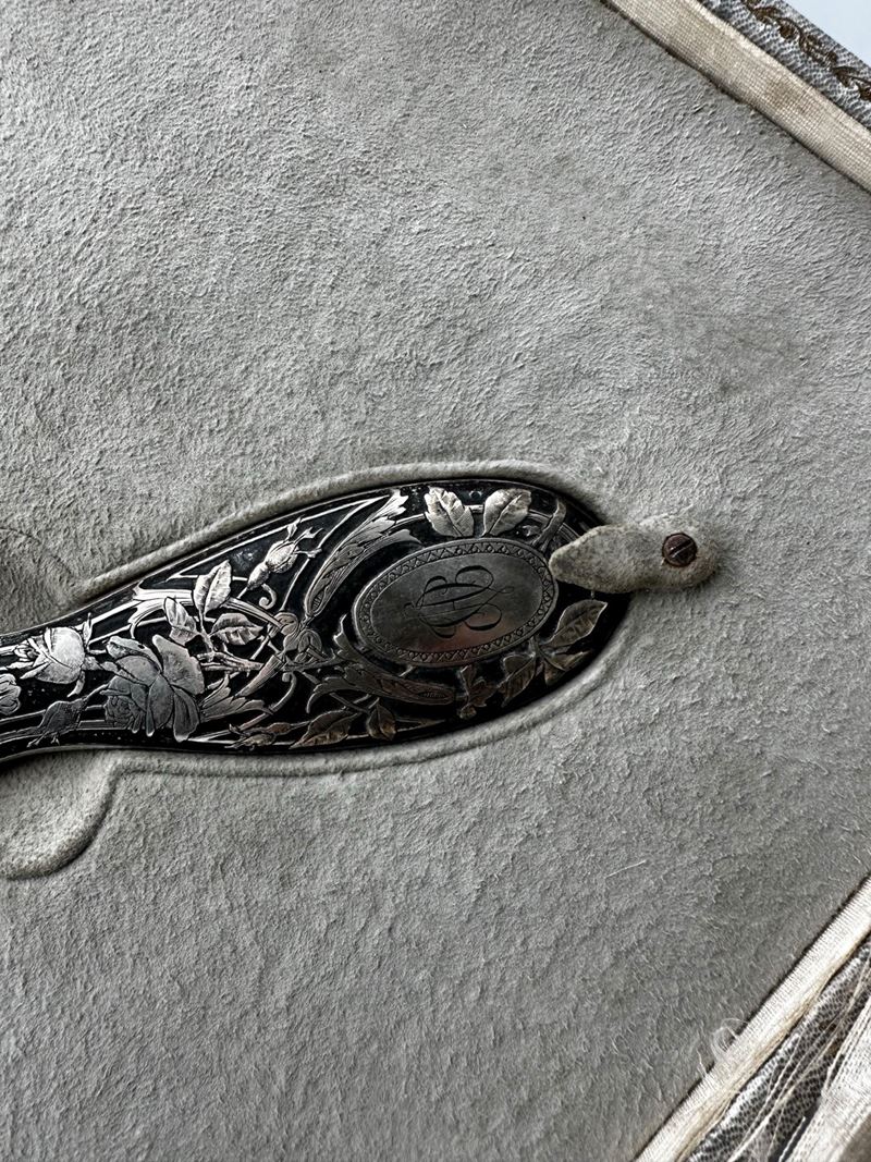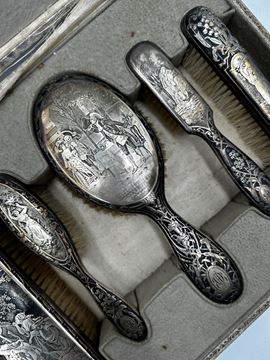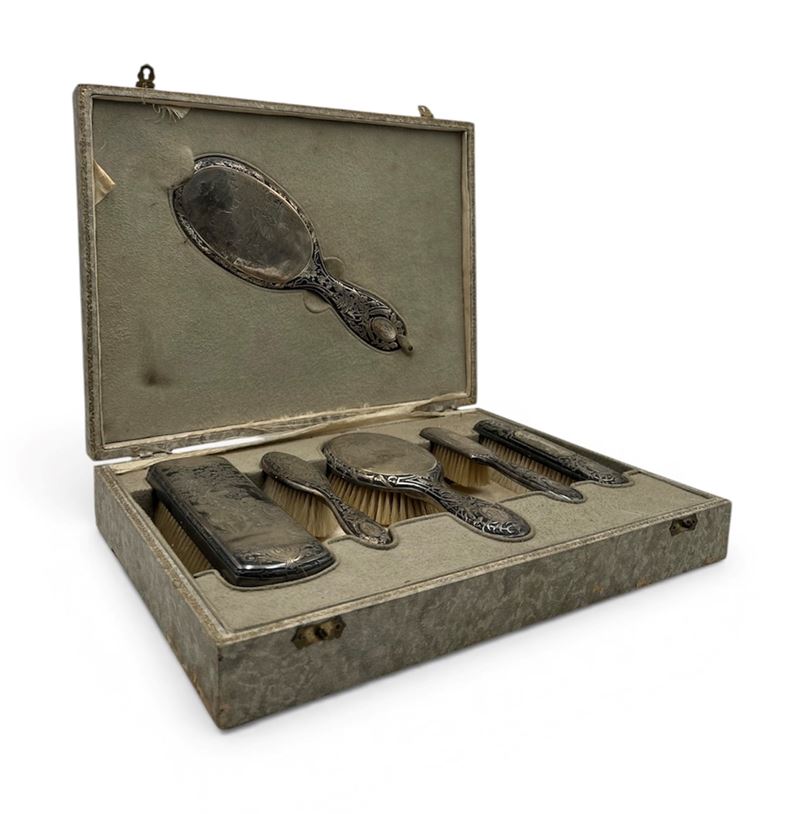 Set da toeletta composto da 6 pezzi in argento lavorato in stile liberty, con decorazioni floreali e scene settecentesche. XX secolo, Italia. Cm scatola 7x35,5x27,5. Peso complessivo: 765 gr.