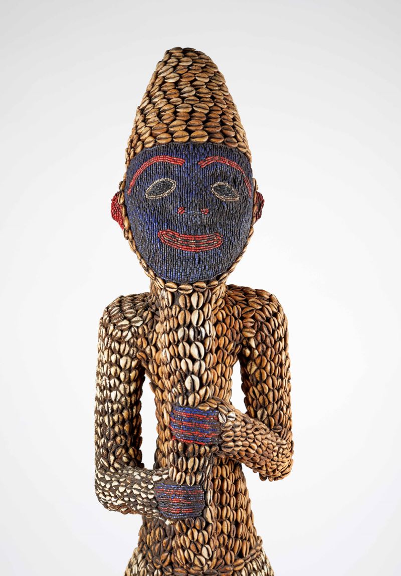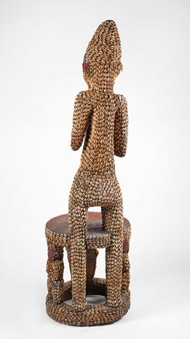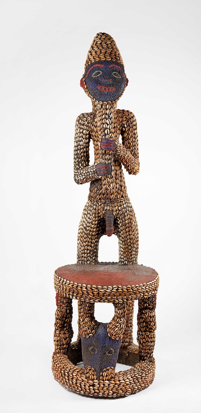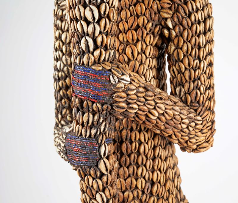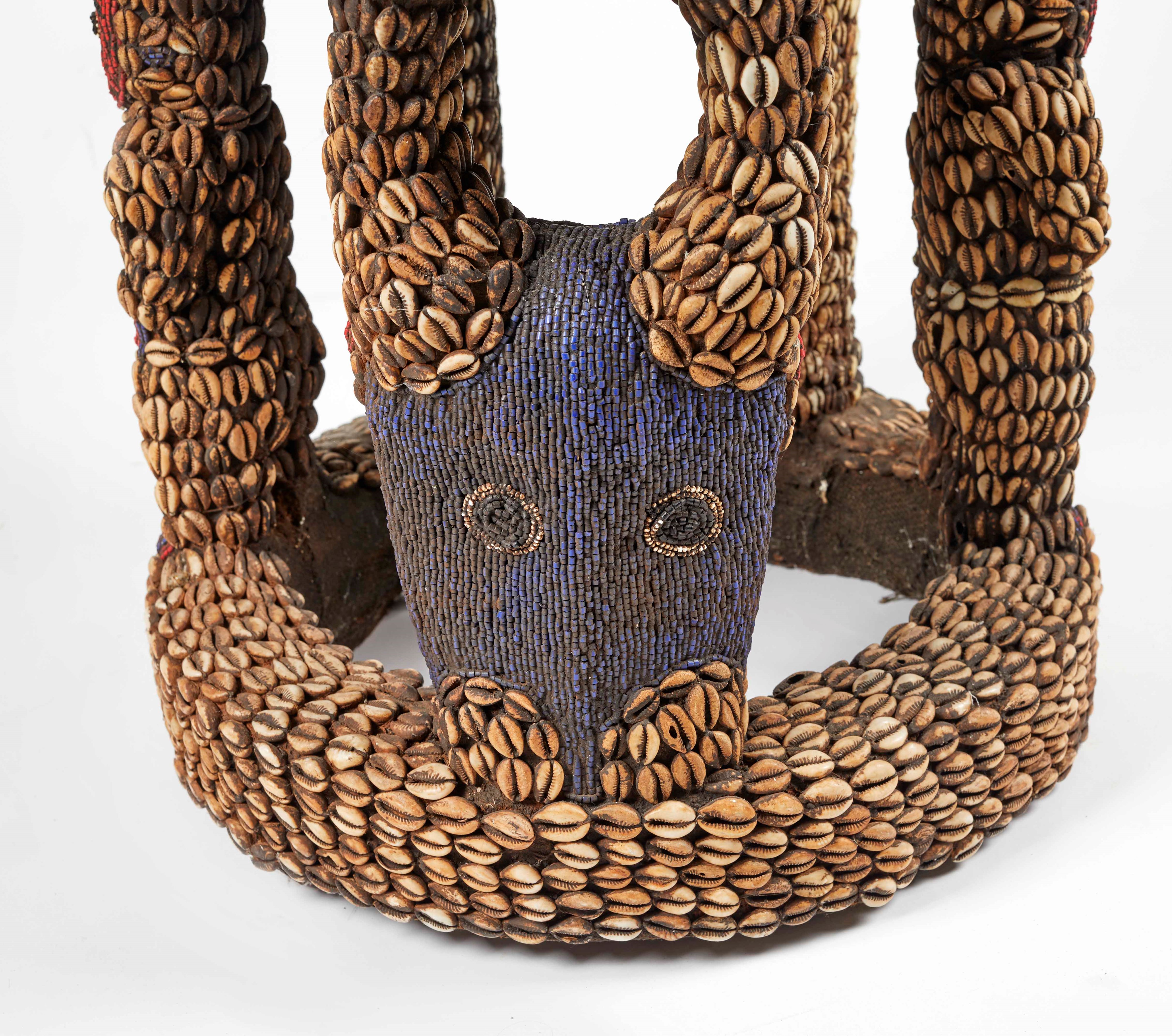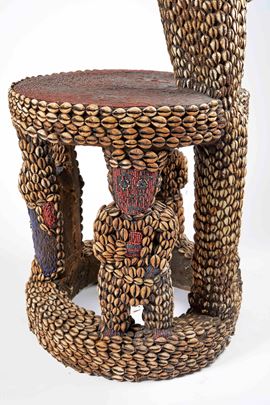 Trono ricoperto in conchiglie cauris e perline di vetro. Bamum, villaggio di Kougnam, circa 25 km a nord di Foumban, Camerun. Cm 160x48x46. Opera accompagnata da autentica su fotografia e certificato di autenticità con perizia firmato da Paolo Morigi, in data 18/11/1985.
