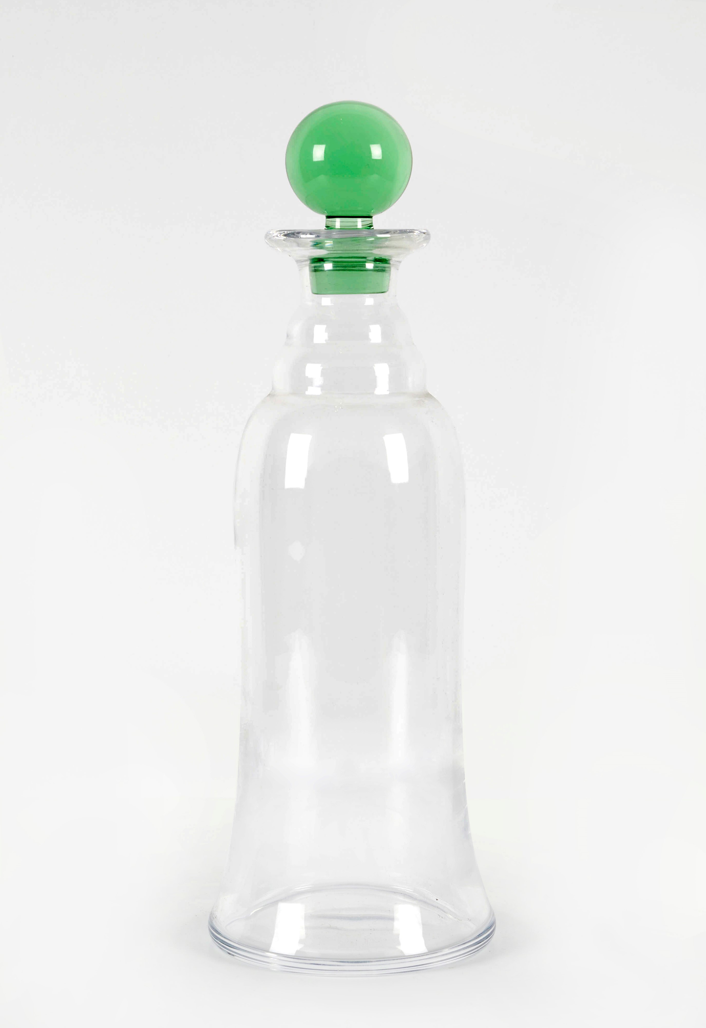 BACCARAT Bottiglia in vetro con tappo verde. XX secolo, Francia. Cm 30x10. Reca firma all'acido ed etichetta Baccarat.