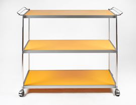 Carrello a 3 piani in metallo verniciato giallo e acciaio cromato. Prod. Italia, anni' 60. Cm 90x116x45.