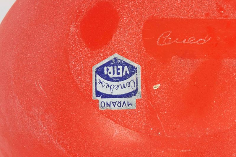 GINO CENEDESE Vaso in vetro rosso ad effetto scavo. Prod. Cenedese Vetri, Italia, anni '70. Cm 19x13x10. Sotto la base reca etichetta Cenedese Vetri, Murano e firma incisa Cenedese.
