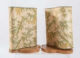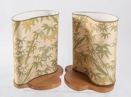 Coppia di lampade da tavolo con base in legno e paralume in tessuto. Prod.