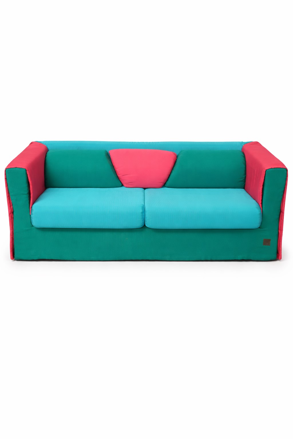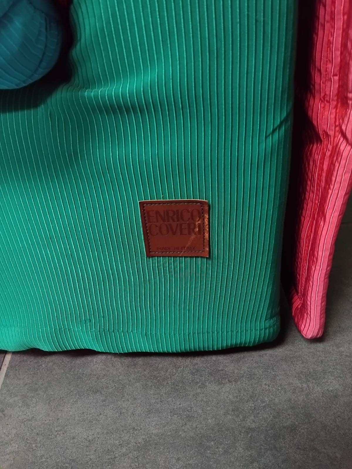 ENRICO COVERI Divano in tessuto a costine sui toni del verde, azzurro e fucsia. Prod. Enrico Coveri, Italia, anni '80. Cm 76x200x90. Reca etichetta Enrico Coveri Made in Italy.