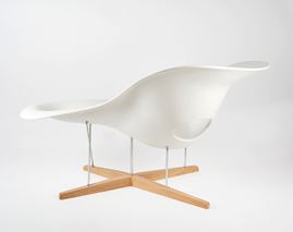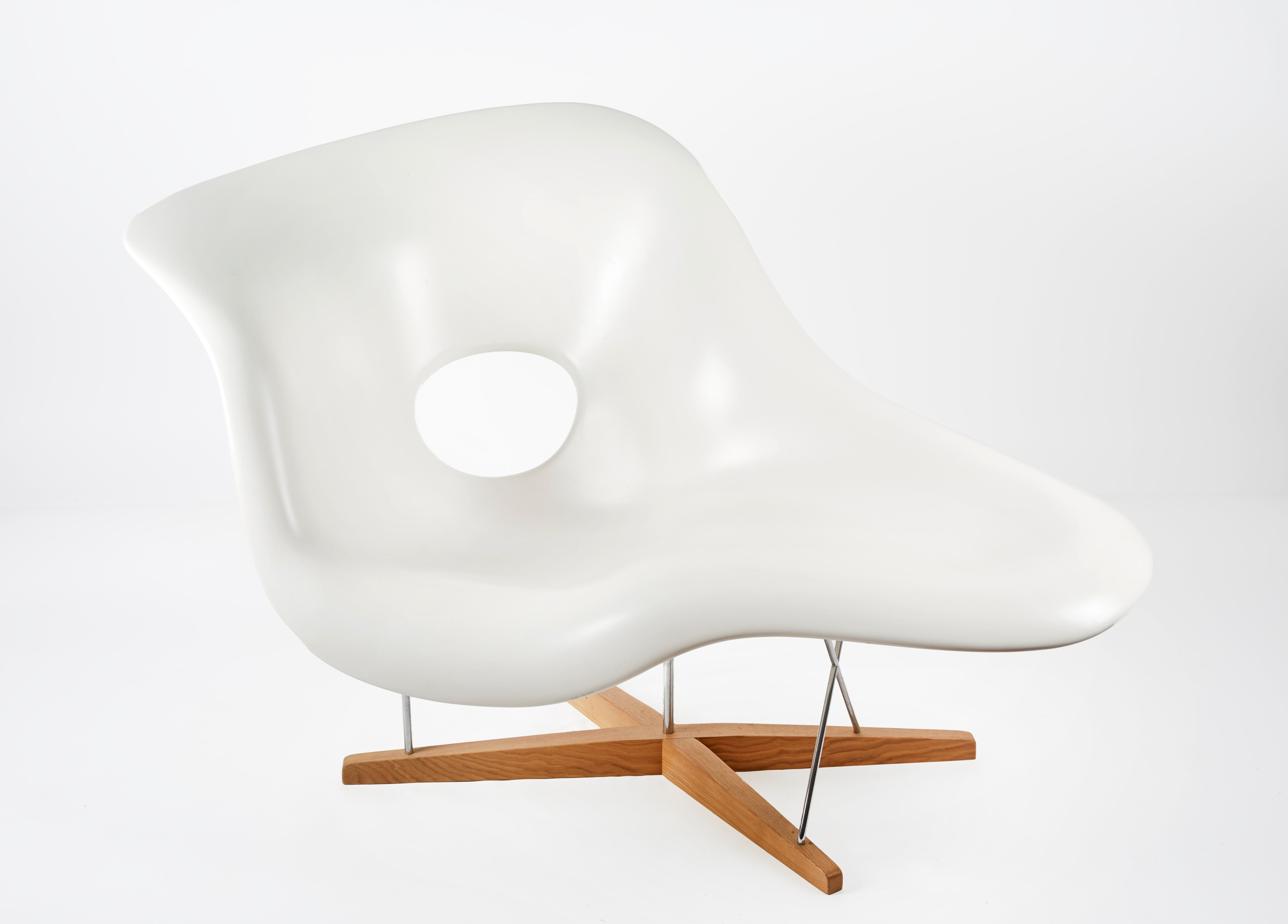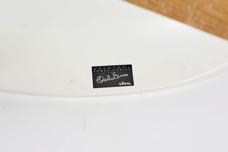 CHARLES & RAY EAMES Sedia modello "La Chaise", 1948. Sedia con struttura in legno e acciaio e seduta in resina poliestere laccata bianca. Prod. Vitra, Italia. Cm 88x147x87. Reca etichetta del produttore.