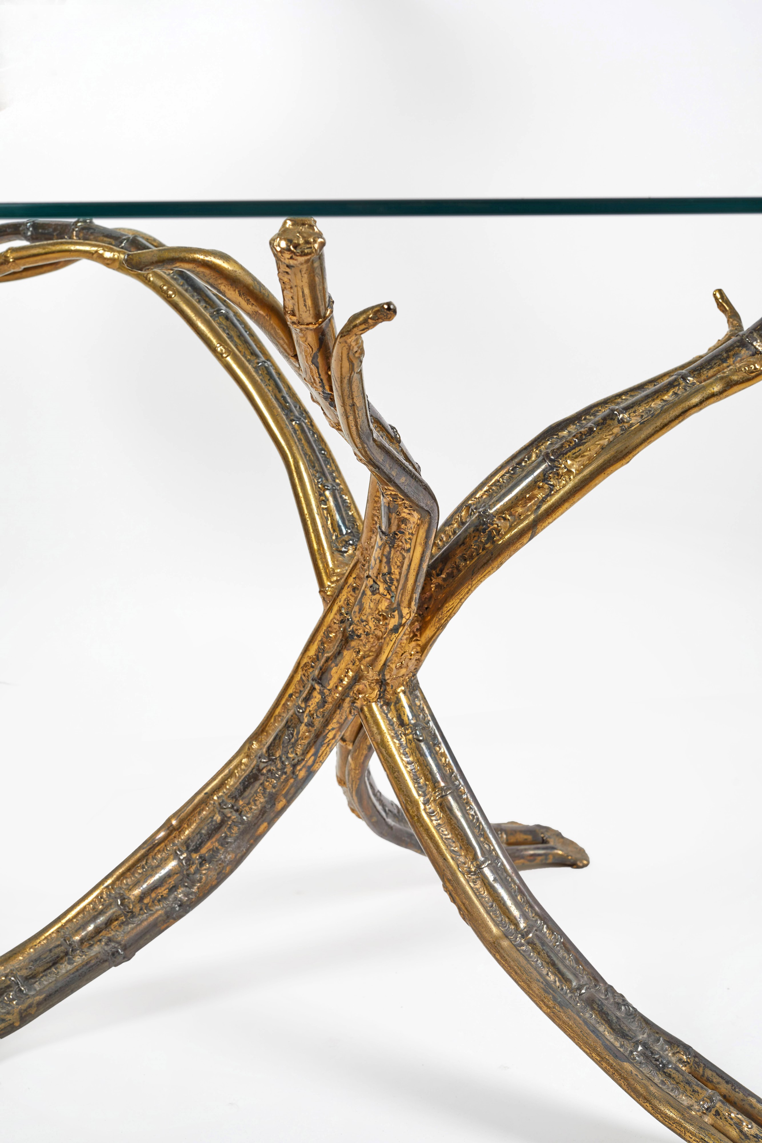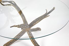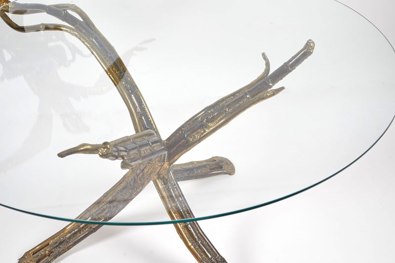 HENRI FERNANDEZ (1919 - 1986) Tavolo-scultura a foggia di aquila con ametista. Struttura in ottone e piano circolare in vetro Prod. Francia, anni ‘70. Cm 117x120ø.