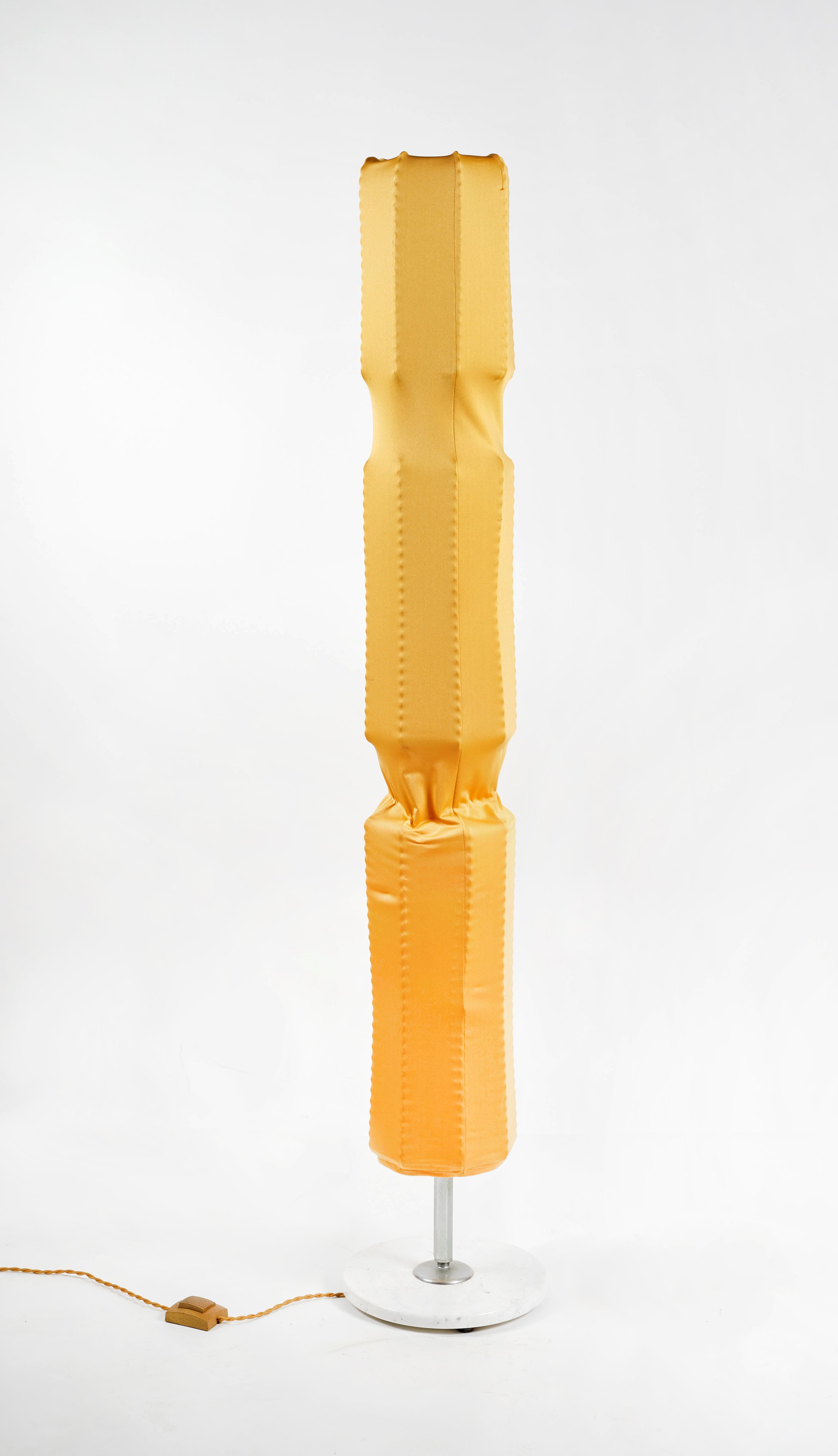 Lampada da terra con struttura in metallo e base in marmo. Paralume in cocoon color senape. Prod. Italia, 1960. Cm 162x30.