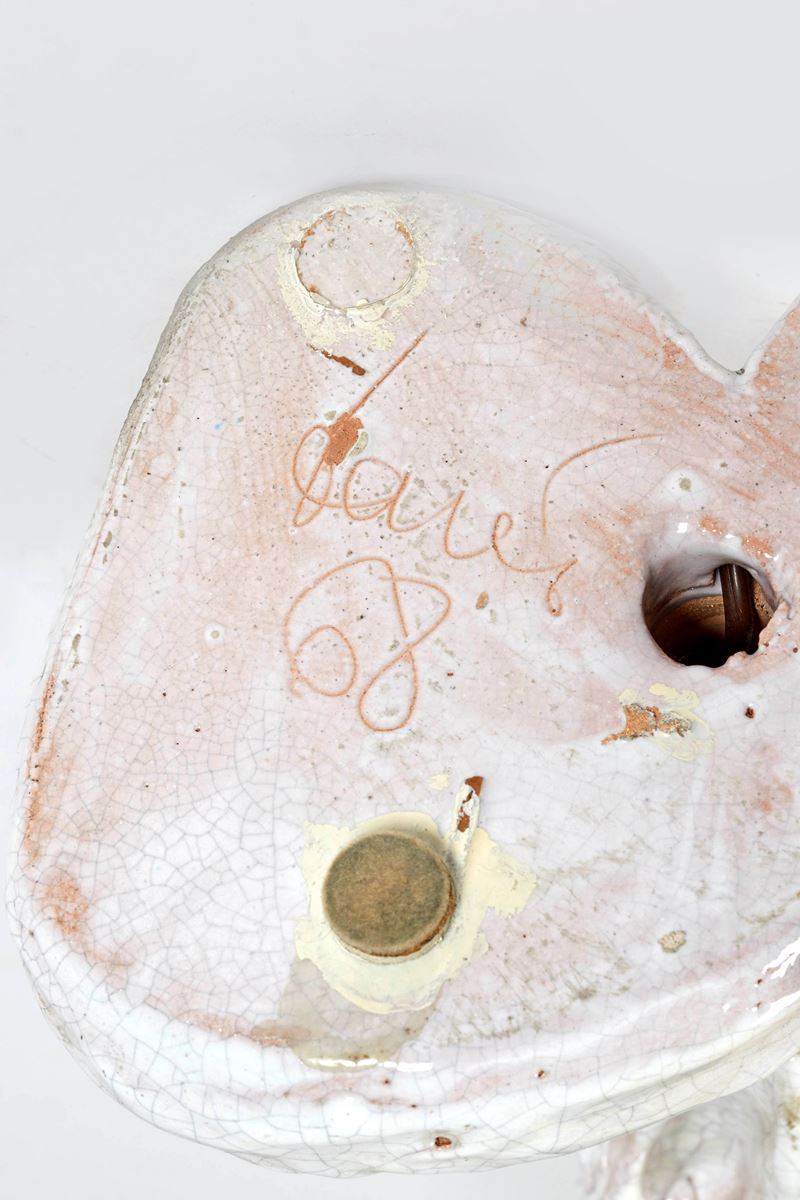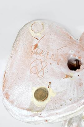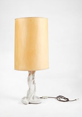 Lampada da tavolo con corpo in ceramica e paralume in tessuto. Prod. Italia, 1968. Cm 87x17. Sotto la base reca firma non decifrata e data.