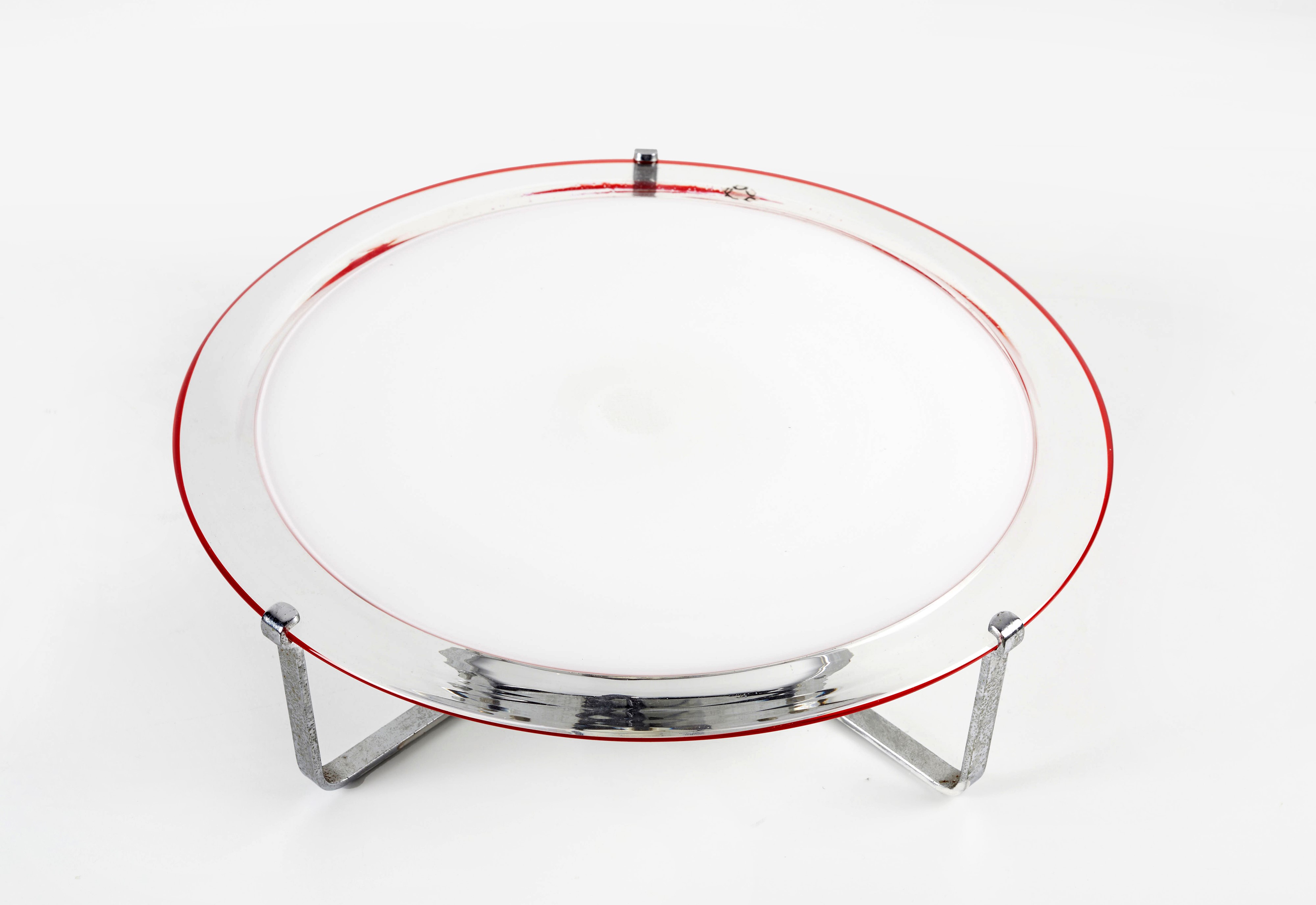LEUCOS Lampada da parete in vetro di Murano bianco trasparente e bordo rosso. Cm 62x62x10. Reca etichetta Leucos.