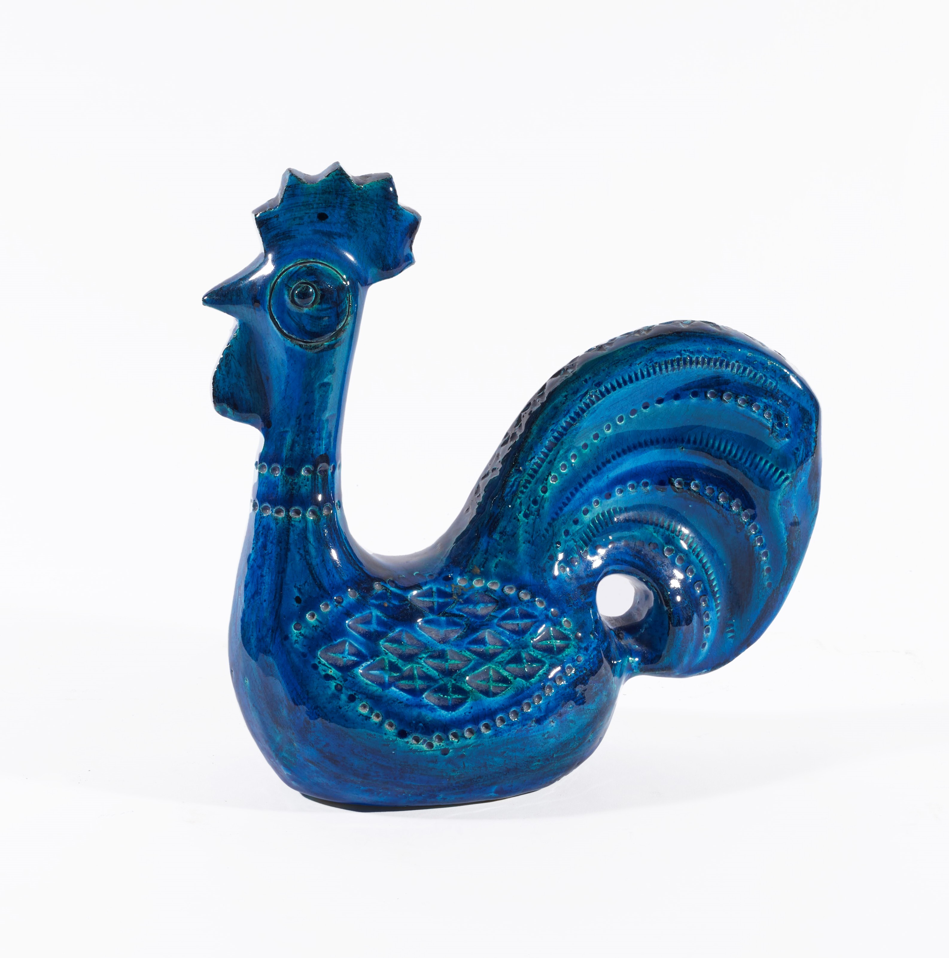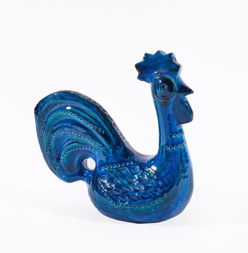 ALDO LONDI Galletto in ceramica dipinta sui toni del blu. Prod. Bitossi, Italia, anni '50. Cm 24x27x11.