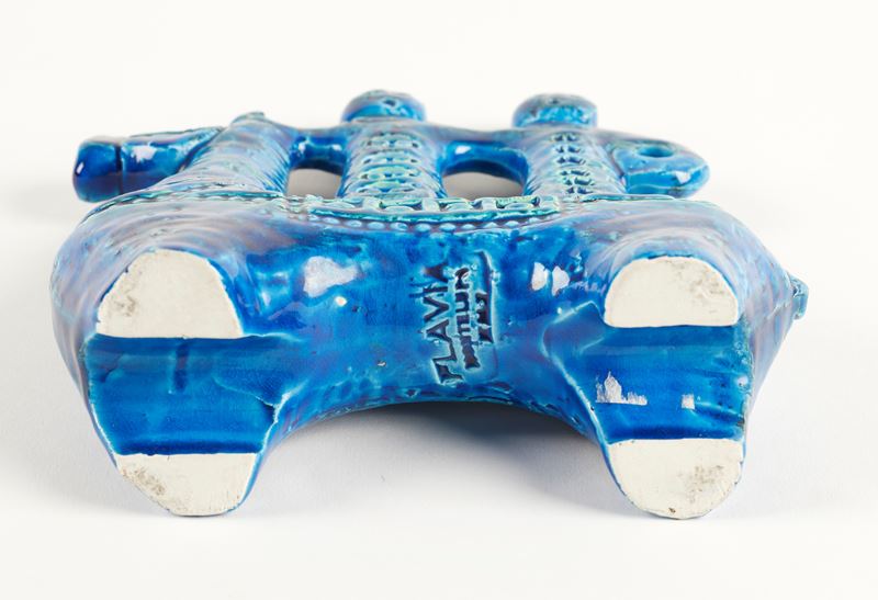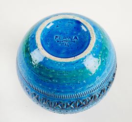 ALDO LONDI Lotto composto da vaso e scultura della serie "Rimini" in ceramica dipinta sui toni del blu e del turchese. Prod. Bitossi, Montelupo Italia, anni '70. Cm (vaso) 12,5x13ø; (scultura) 17x16x6. Sotto la base recano marchio Flavia Montelupo, Italy.