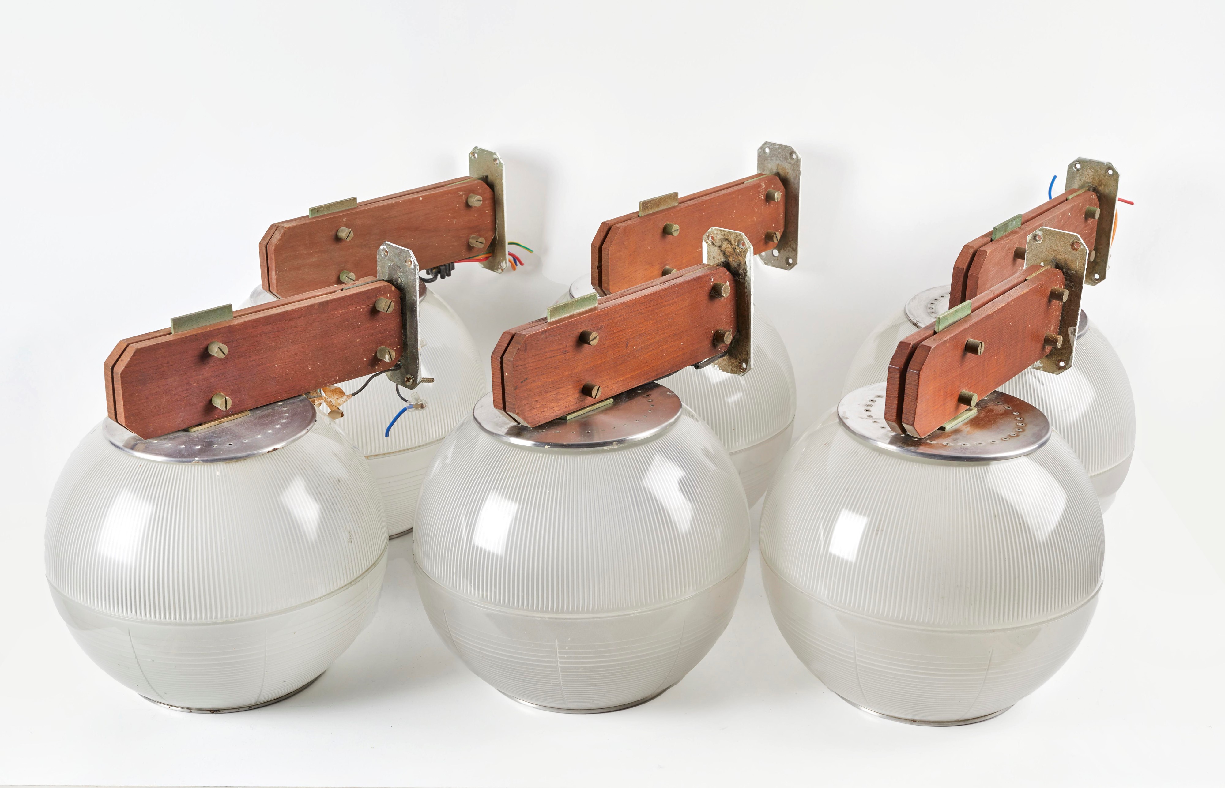 Lotto composto da 6 applique con struttura in legno e ottone e bulbo in vetro. Prod. Italia, 1950-1960. Cm 30x29x21.
