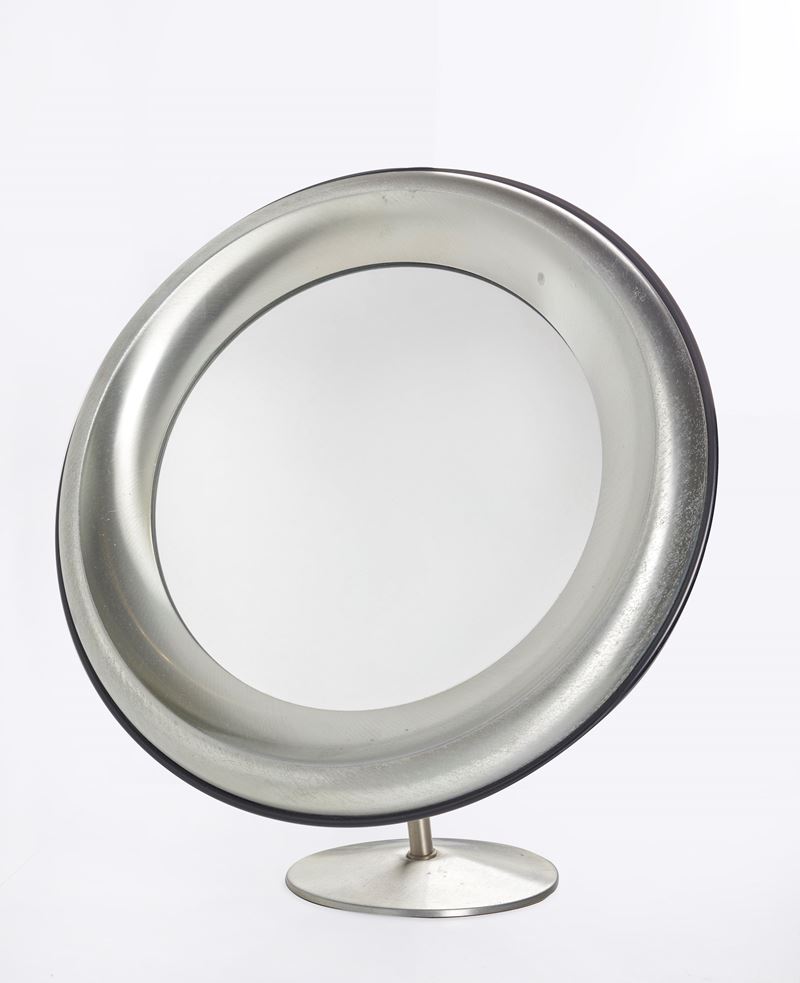 GAETANO MISSAGLIA Specchio orientabile da tavolo, in acciaio. Prod. Italia, anni '60. Cm 48x43. Al retro reca etichetta Missaglia.