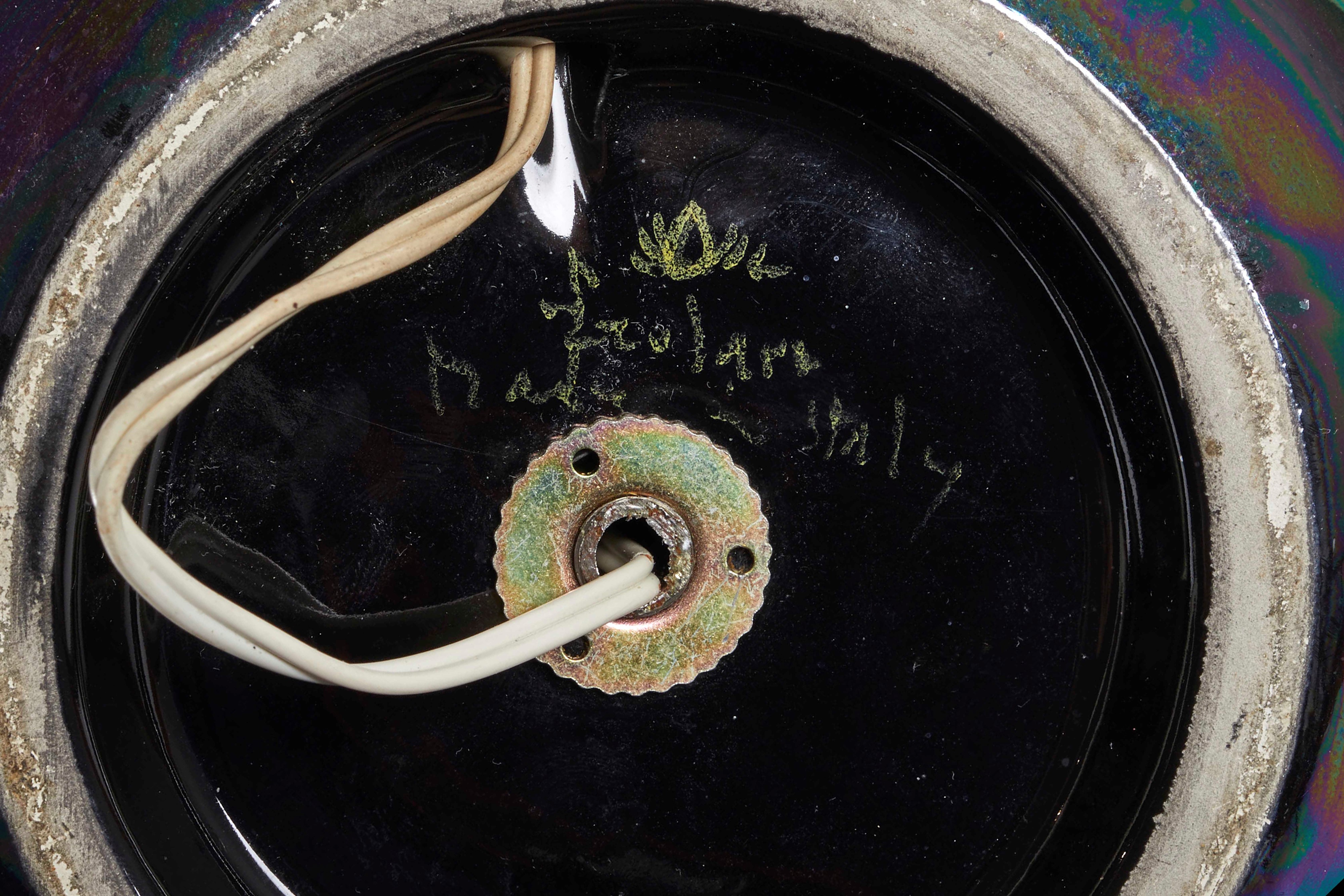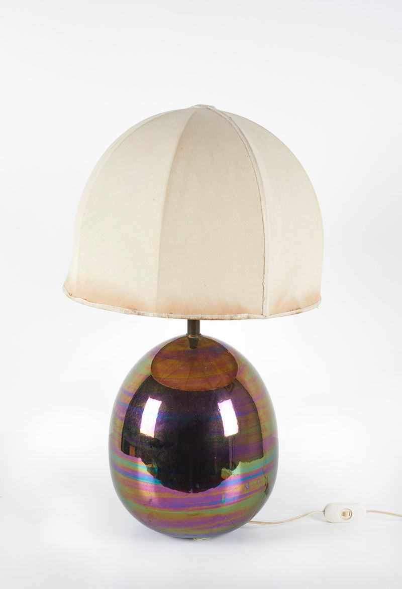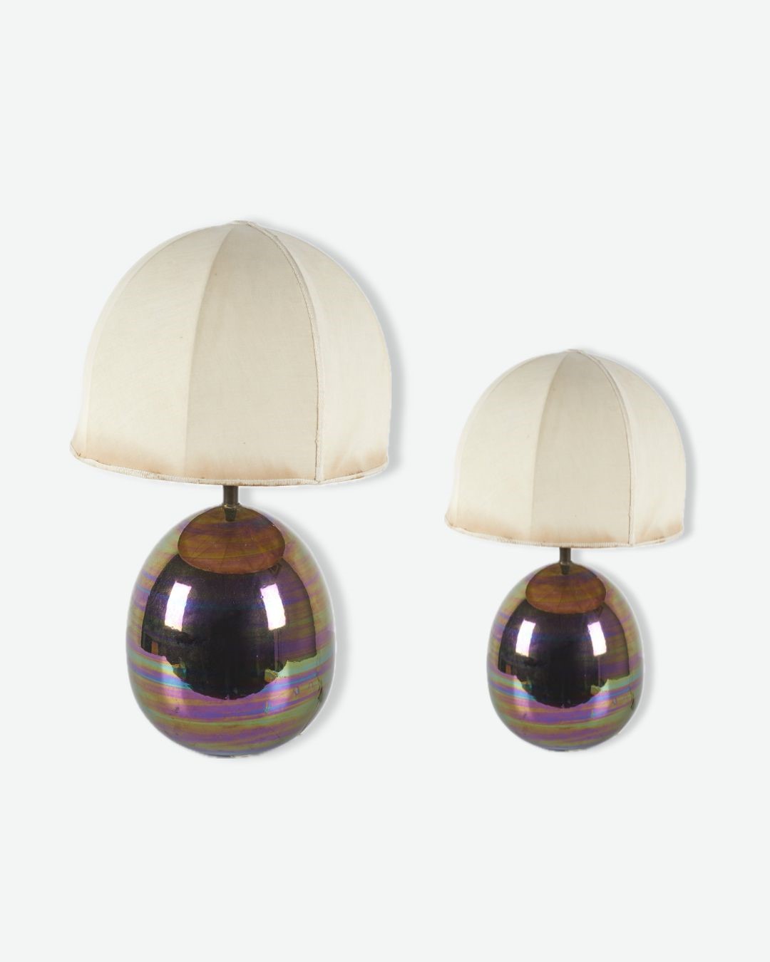 SCANABISSI, Bologna. Coppia di lampade in ceramica dipinta a lustro sui toni del viola e paralume in tessuto. Prod. Bologna, Italia. Seconda metà del XX secolo. Cm rispettivamente 50x33; 40x24. Sotto la base recano etichetta Scanabissi.