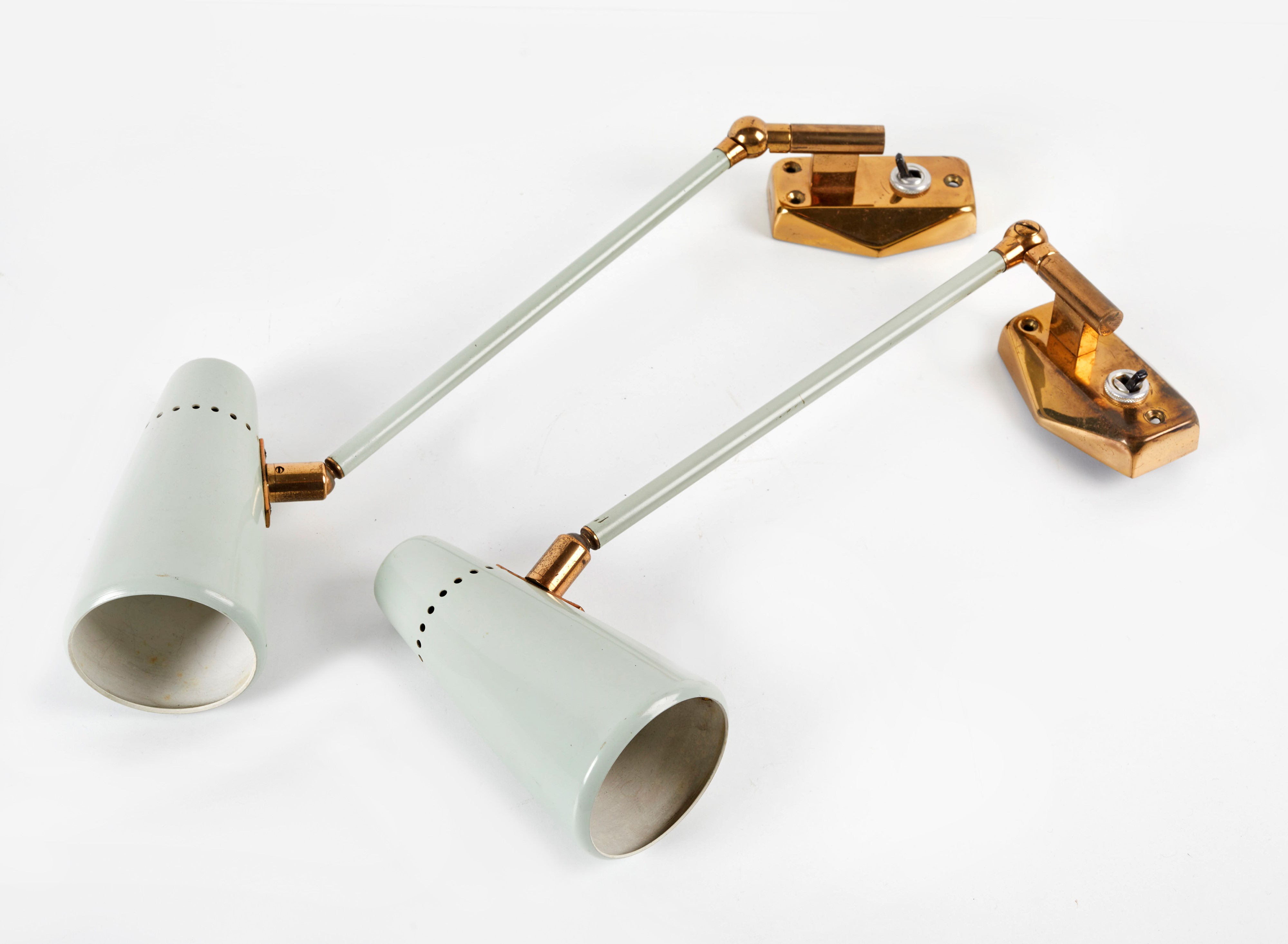 STILNOVO Coppia di lampade da parete con struttura regolabile in ottone e diffusore in metallo laccato. Prod. Stilnovo, Italia, anni '50. Cm 86x10ø (lievi difetti)
