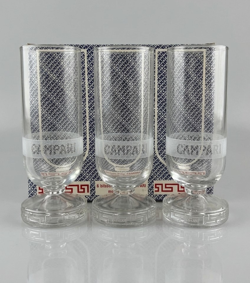 MATTEO THUN (Bolzano 1952) Lotto composto da 6 bicchieri Bitter Campari modello "Greca". Prod. Alessi, Italia, 1986. Entro scatola originale.